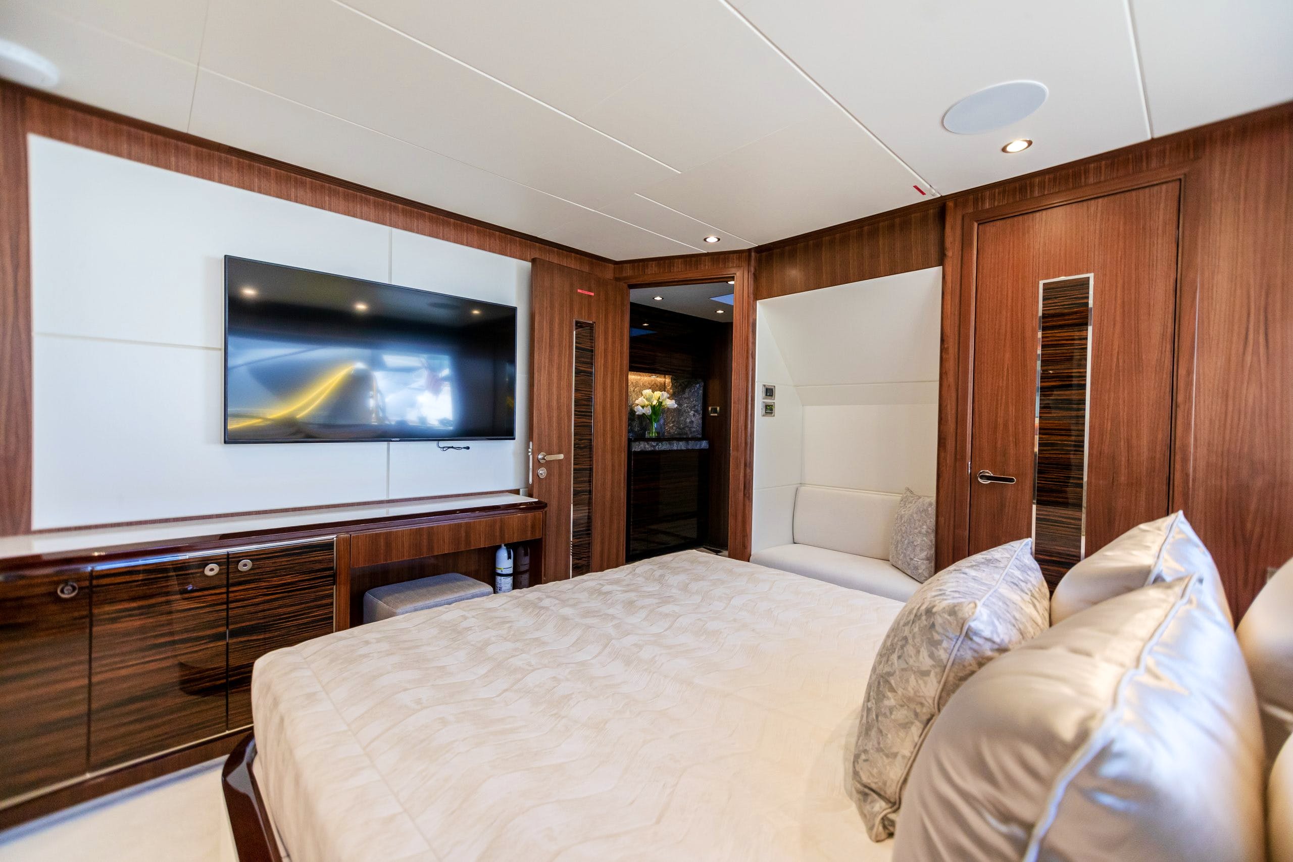 She sleeps up to 10 charter guests in 5 deluxe ensuite staterooms, with further cabins on board that accommodate a professional crew.