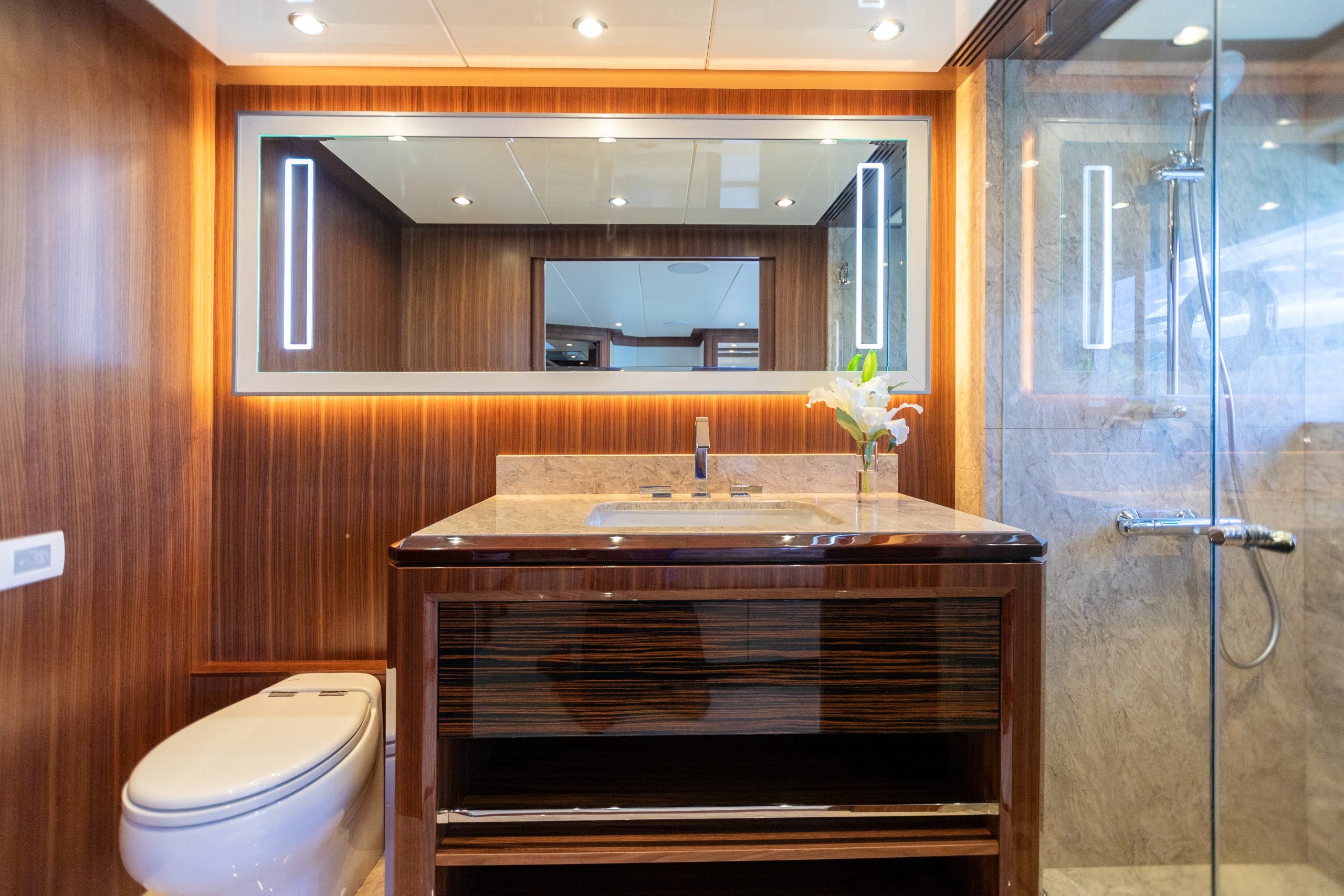 She sleeps up to 10 charter guests in 5 deluxe ensuite staterooms, with further cabins on board that accommodate a professional crew.