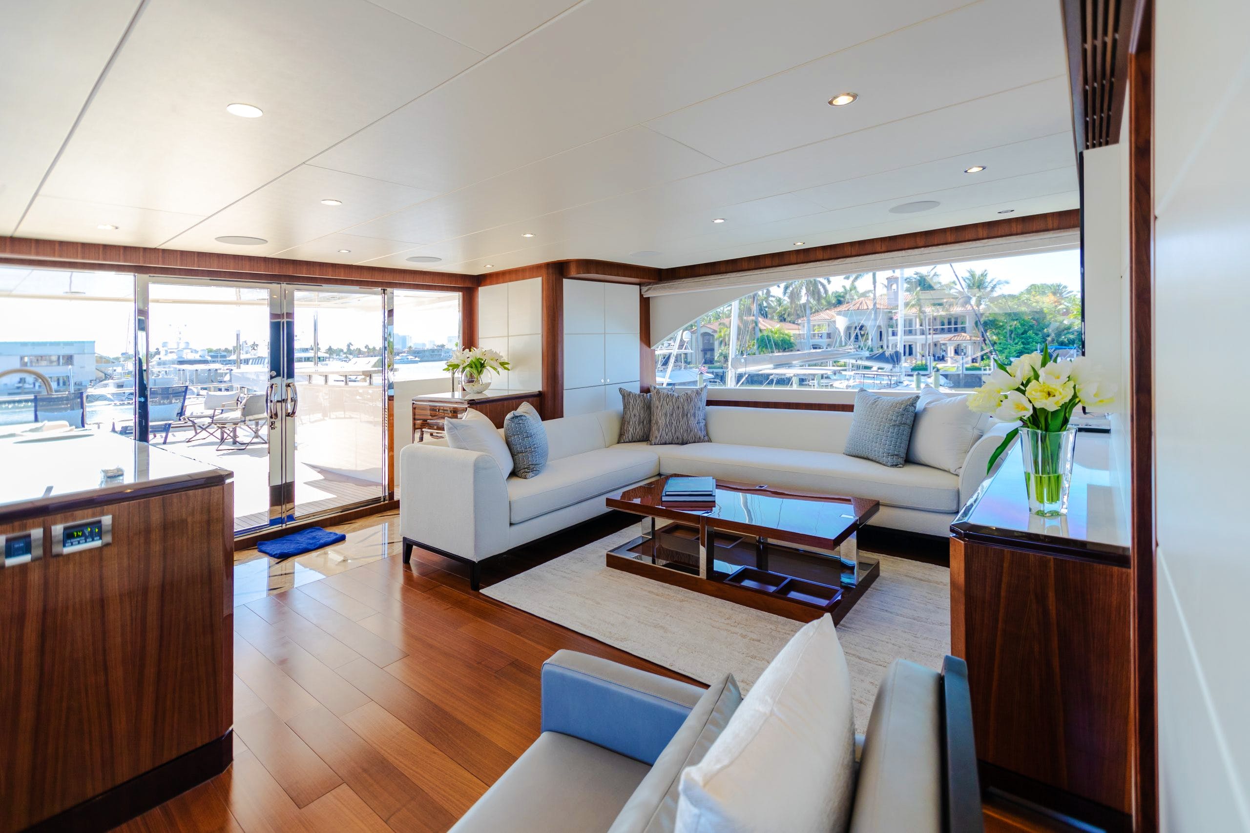 Guests have a lounge to starboard on the upper deck aft comprised of a sofa and two armchairs around a coffee table, while a wet bar is adjacent.