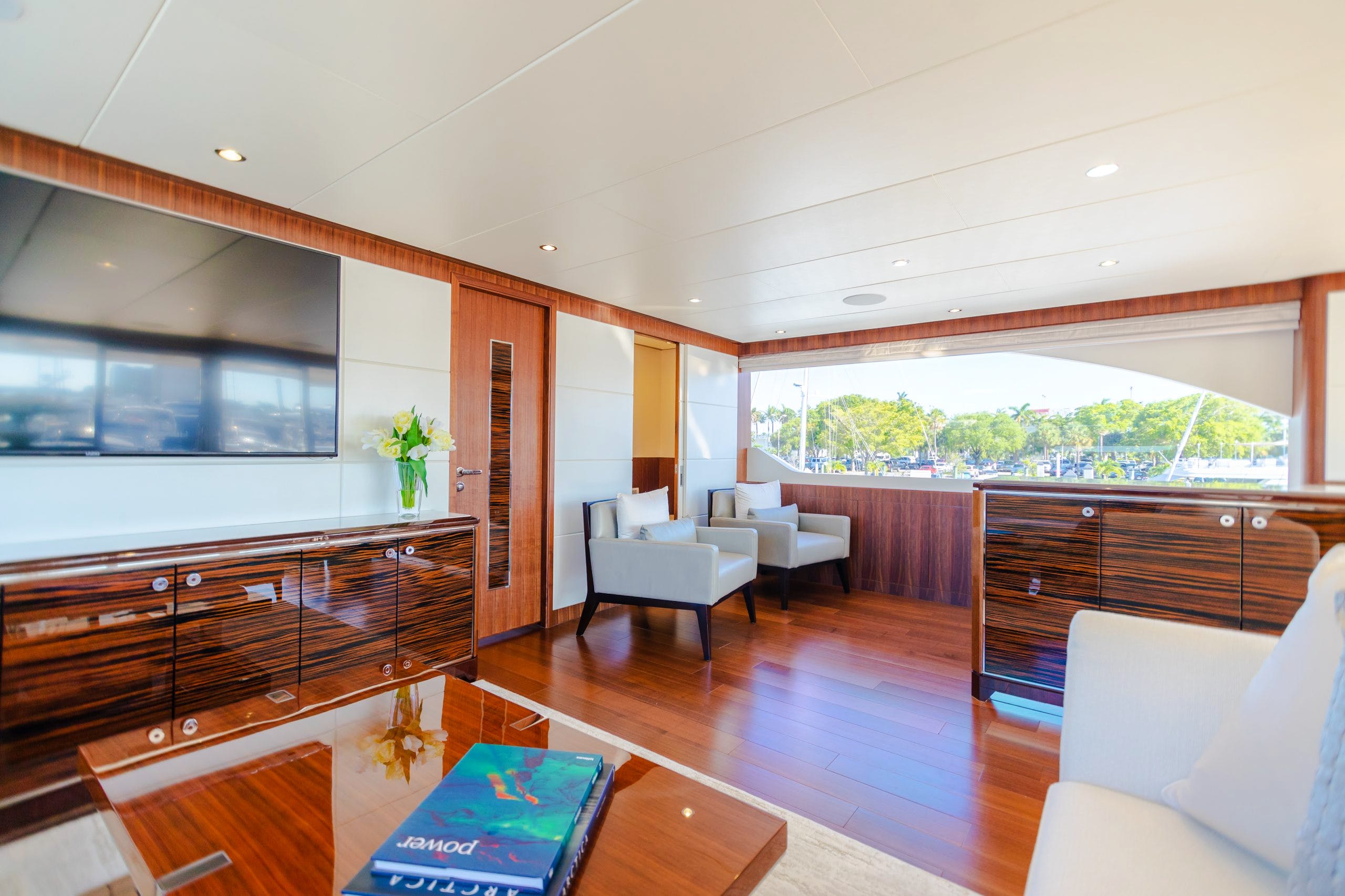 Guests have a lounge to starboard on the upper deck aft comprised of a sofa and two armchairs around a coffee table, while a wet bar is adjacent.