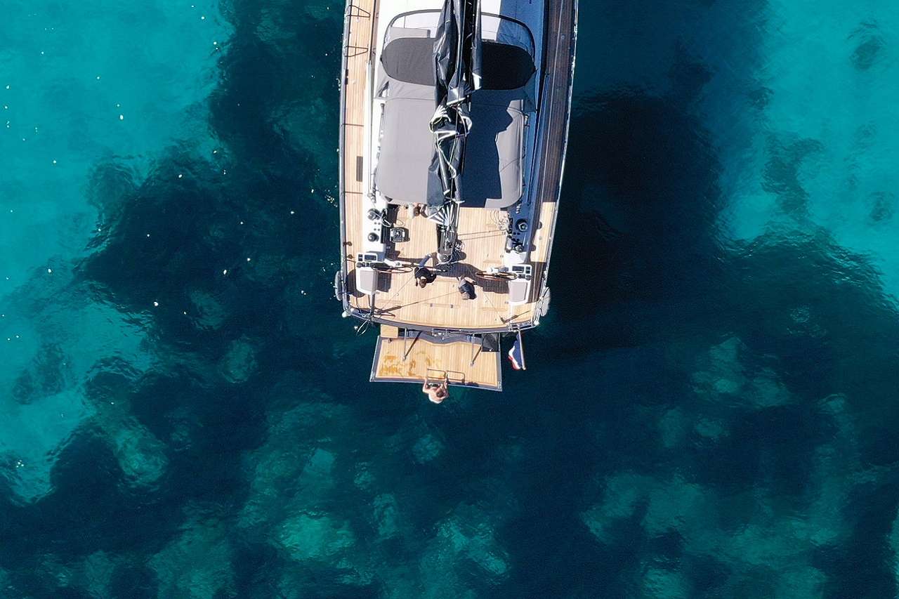 Farther aft, the transom door folds down to become a swim platform over the water, while the foredeck provides plenty of space for sunbathing, exercise such as yoga, and a place to watch passing wildlife.