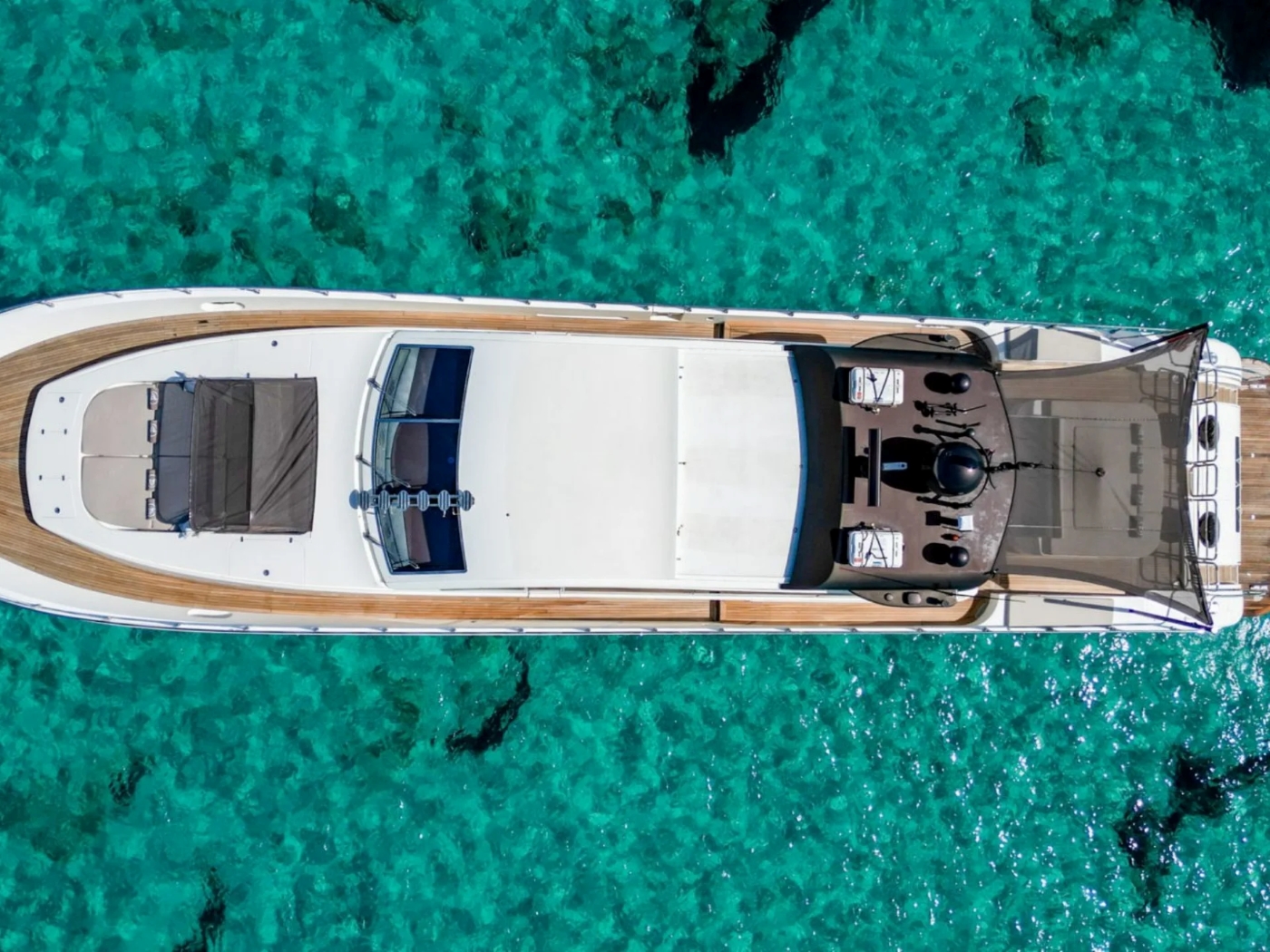 This sunbed can be converted into an alfresco dining area, with a large raised table surrounded on three sides by seating, enjoying sweeping views out over the stern. Two stairways lead down to the lower deck swim platform for ...