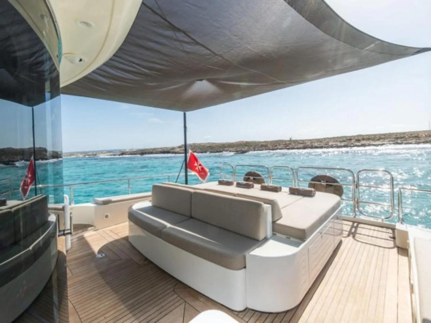 The main deck aft offers a forward-facing sofa that joins into a large sunbed along the stern.