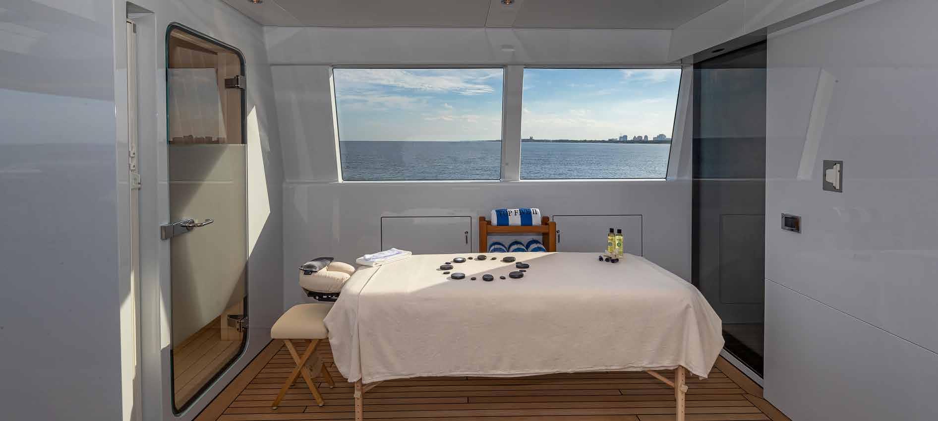 The main deck aft is shaded by the upper deck overhang and is lined with a sofa along the stern, with plenty of space for an alfresco dining setting close to the doors into the main salon.