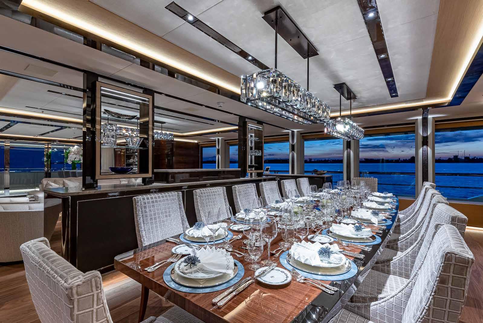 The main deck aft is shaded by the upper deck overhang and is lined with a sofa along the stern, with plenty of space for an alfresco dining setting close to the doors into the main salon.