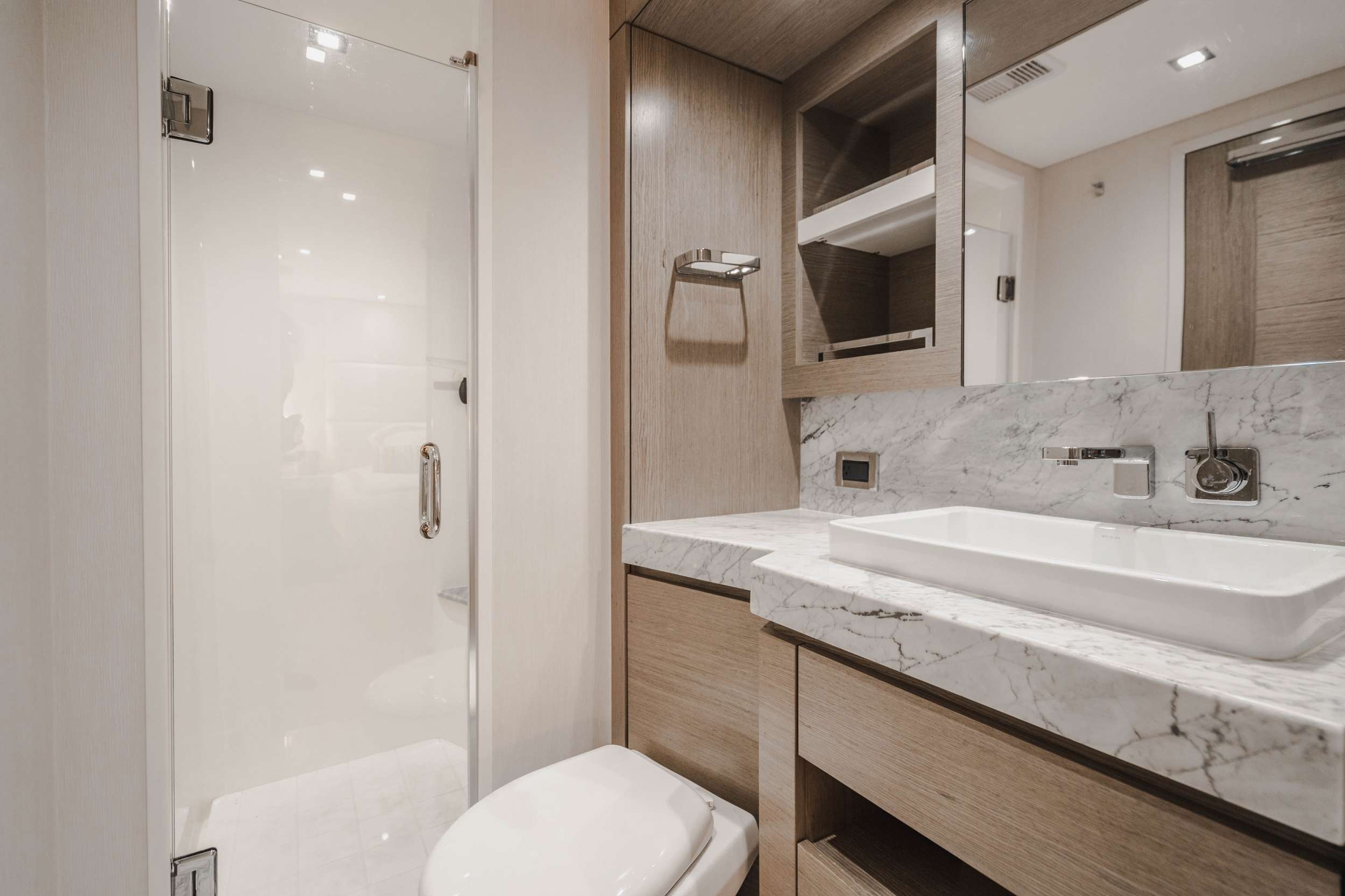 There is a wet bar and widescreen TV to port, and a stairway to the upper deck to starboard. Two stairways connect to the lower deck swim platform below, where there is enough room for sunbathing or lounging beside the ...