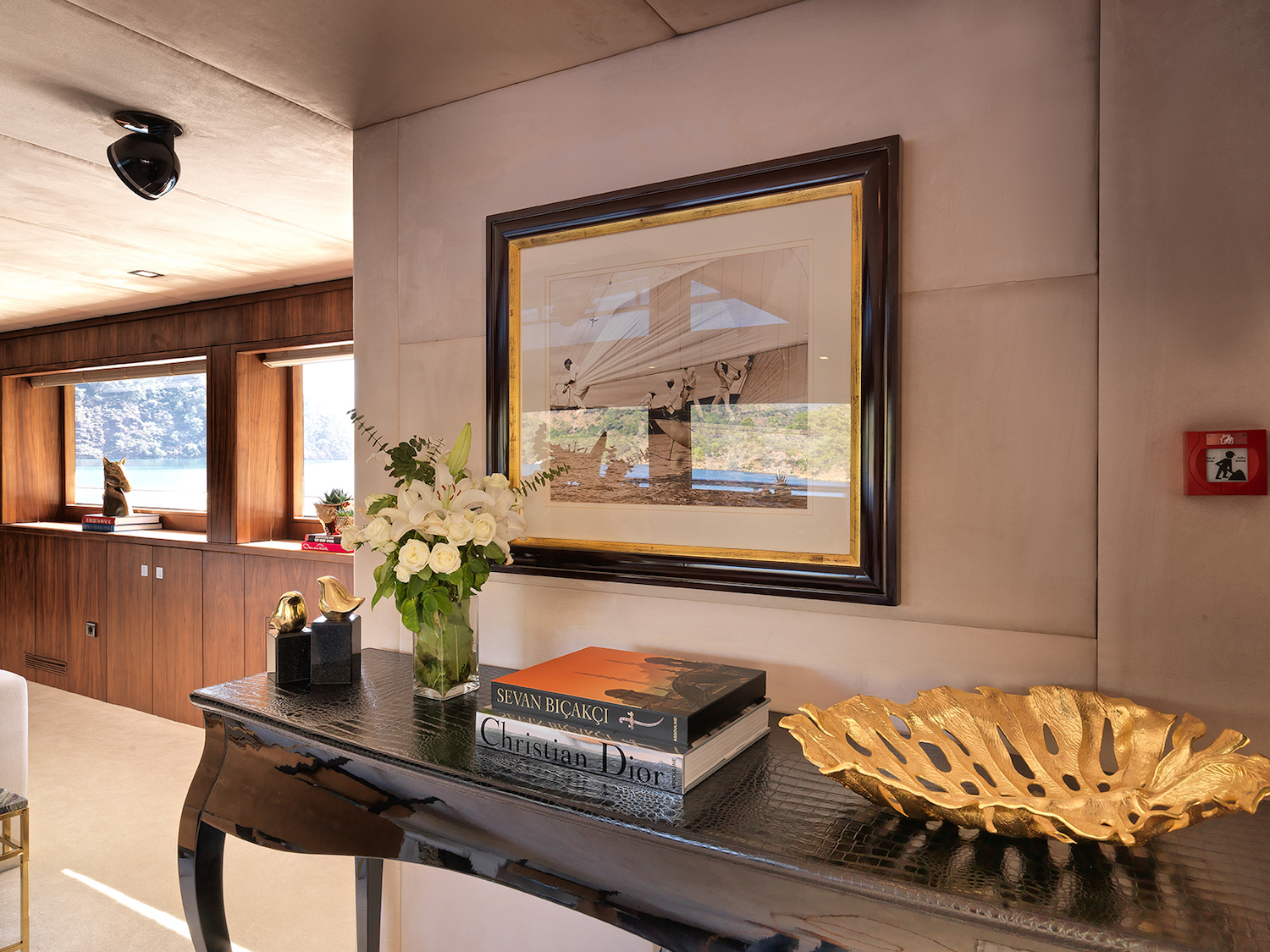 The dressing room is forward to port and the en-suite bathroom to starboard, fitted with two sinks, a toilet and shower.