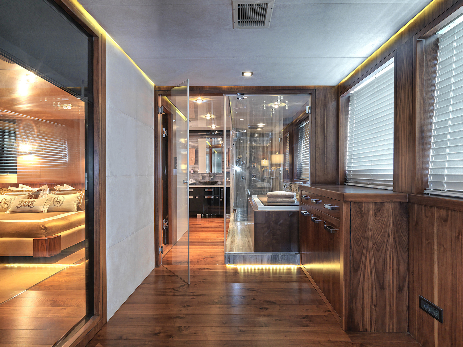 The salon occupies the aft section of this space and provides two long plush sofas around two large coffee tables, with a widescreen TV for entertainment during transit.