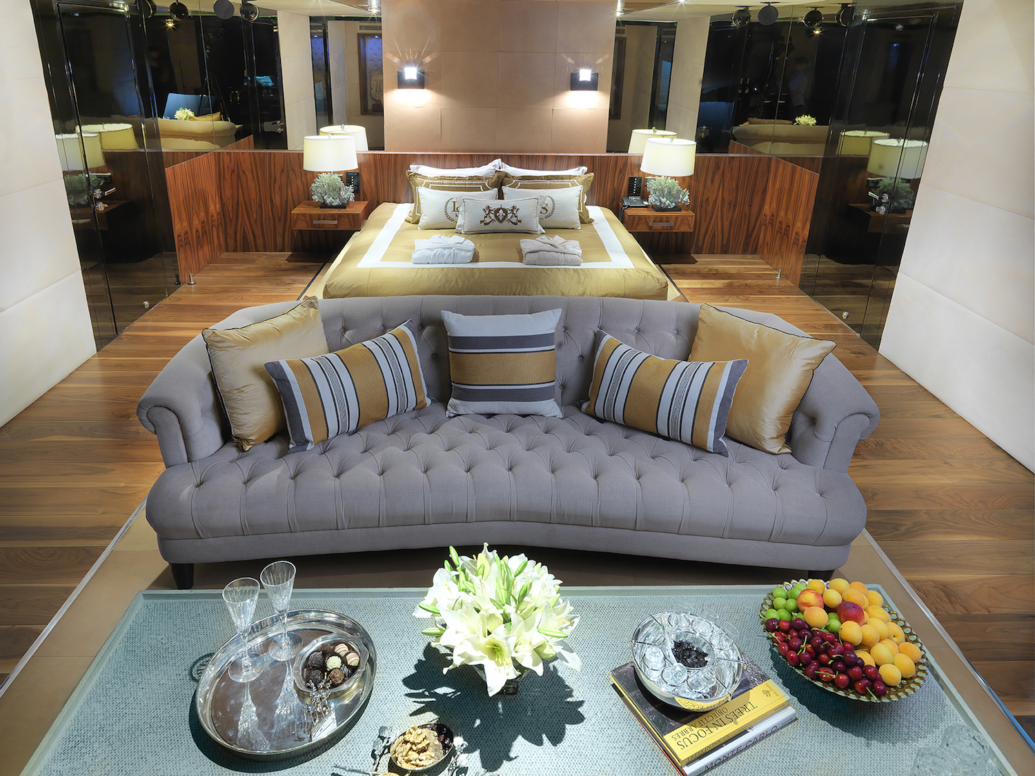 Here, a sofa lines the stern and a U-shaped dining area/bar is placed amidships beneath the shade of the hardtop. The forward open area is furnished with a sofa, oversized armchair and a drinks table for drinks, casual meals and ...