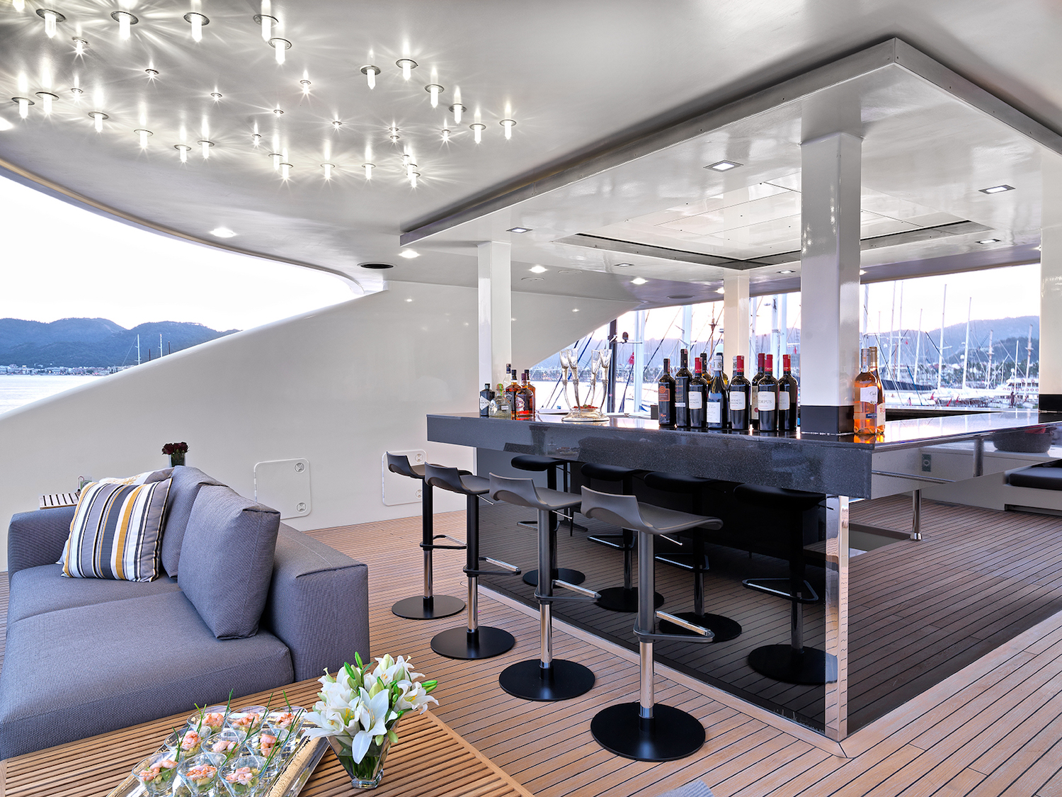 Here, a sofa lines the stern and a U-shaped dining area/bar is placed amidships beneath the shade of the hardtop. The forward open area is furnished with a sofa, oversized armchair and a drinks table for drinks, casual meals and ...