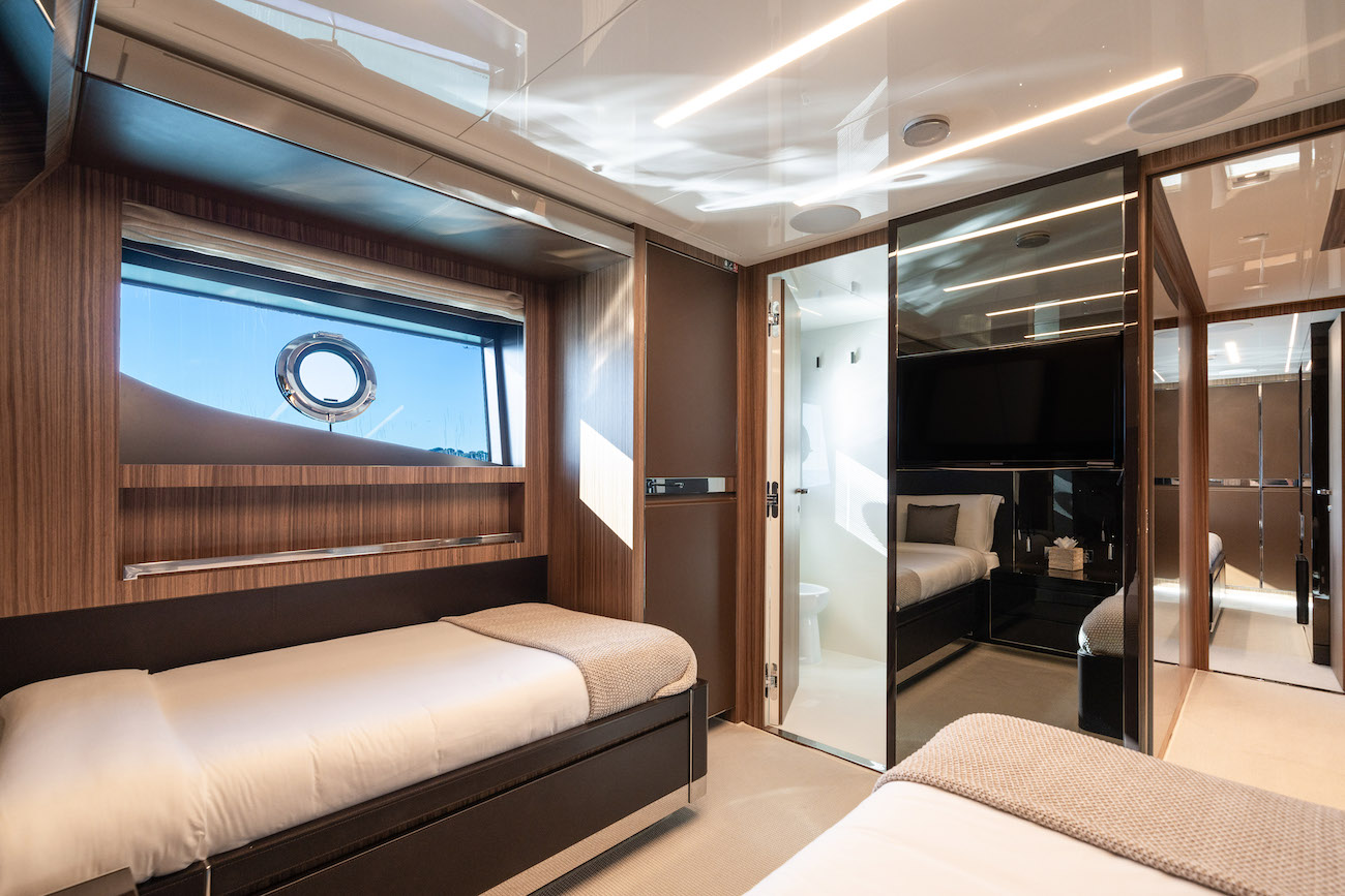 The formal dining area seats all guests in comfort in sophisticated surroundings, and behind a corner sofa, coffee table and armchair furnish the starboard side of the room while a widescreen TV is opposite and large glass ...