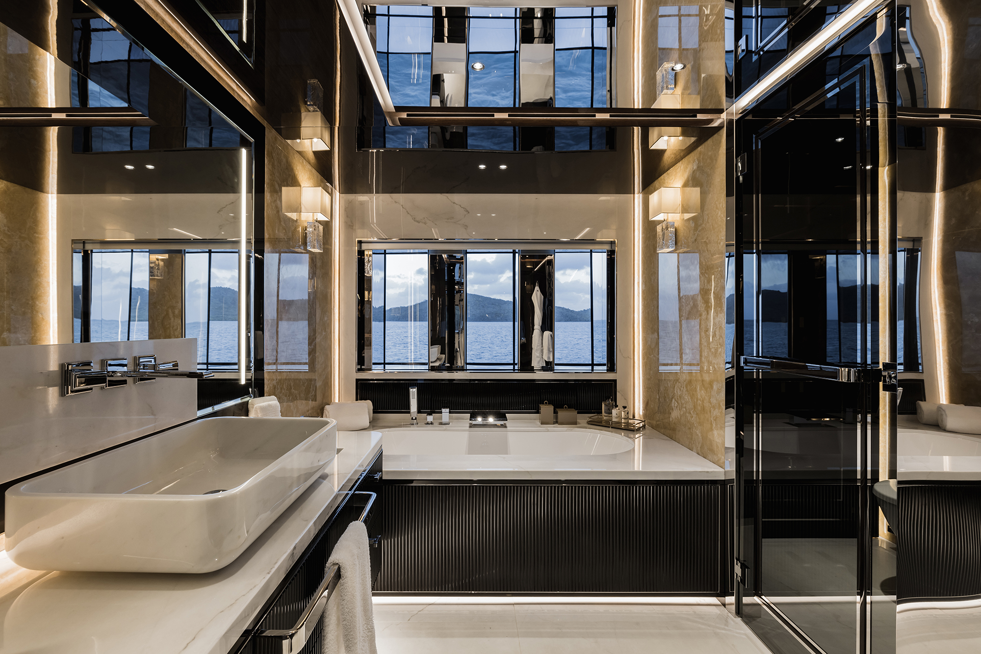 ~ There are fold-down terraces on both sides of the room, and the forward section has a large dressing room in the centre with an en-suite bathroom on both sides. The en-suite bathrooms both have a sink, toilet and bidet, and ...