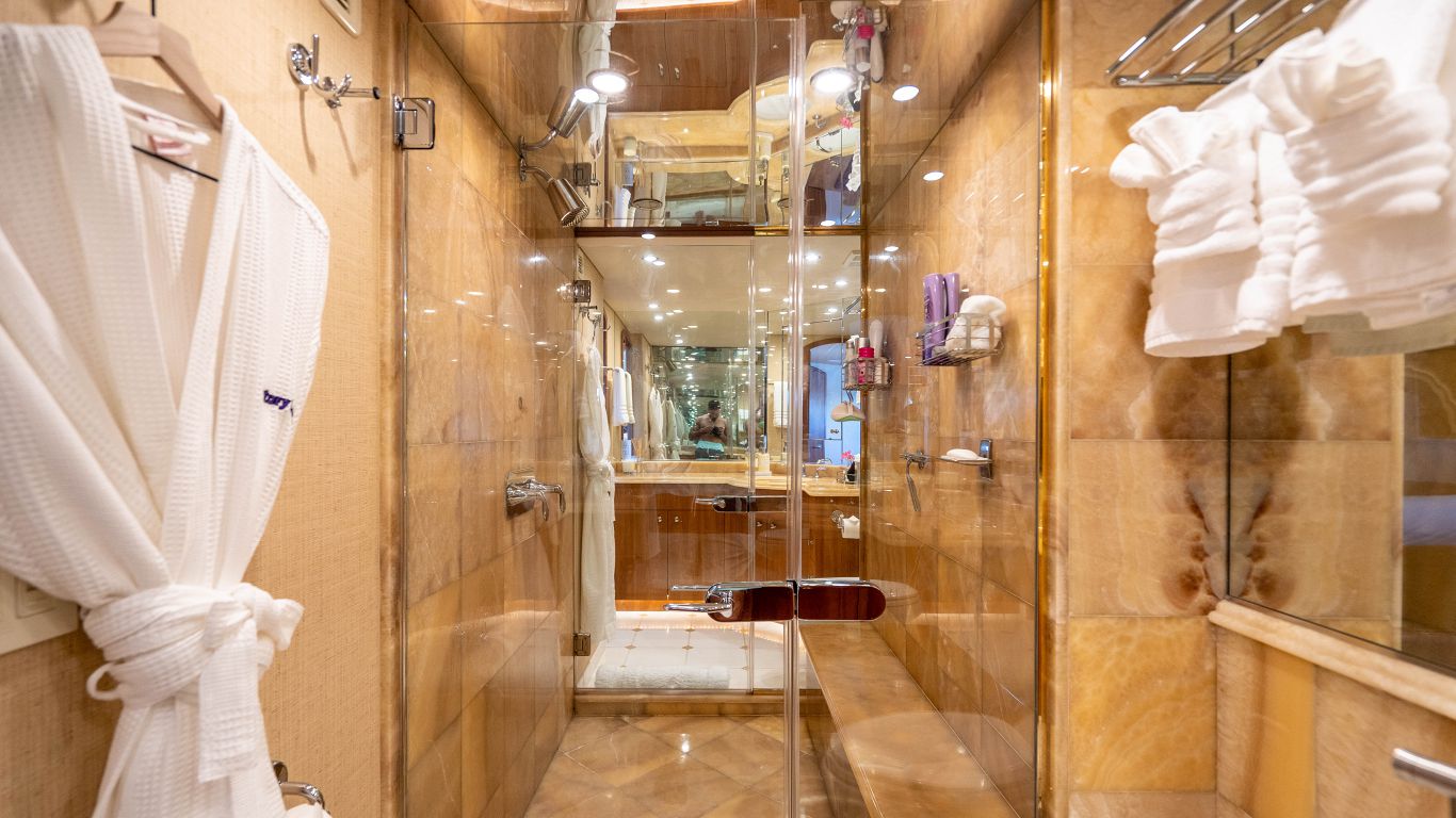The raised pilothouse is above, through which guests have access to the flybridge.