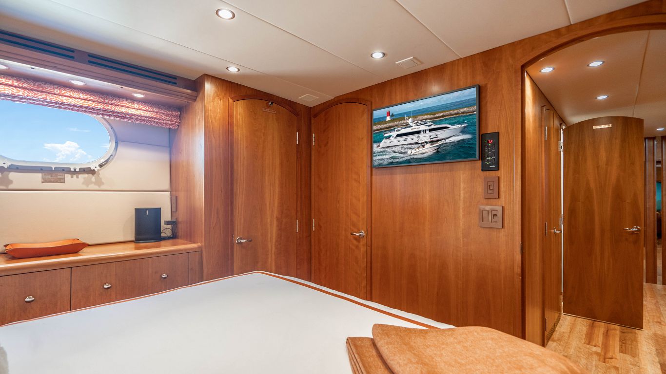 The salon places a corner sofa, armchair and coffee table to starboard, with a widescreen TV to port.