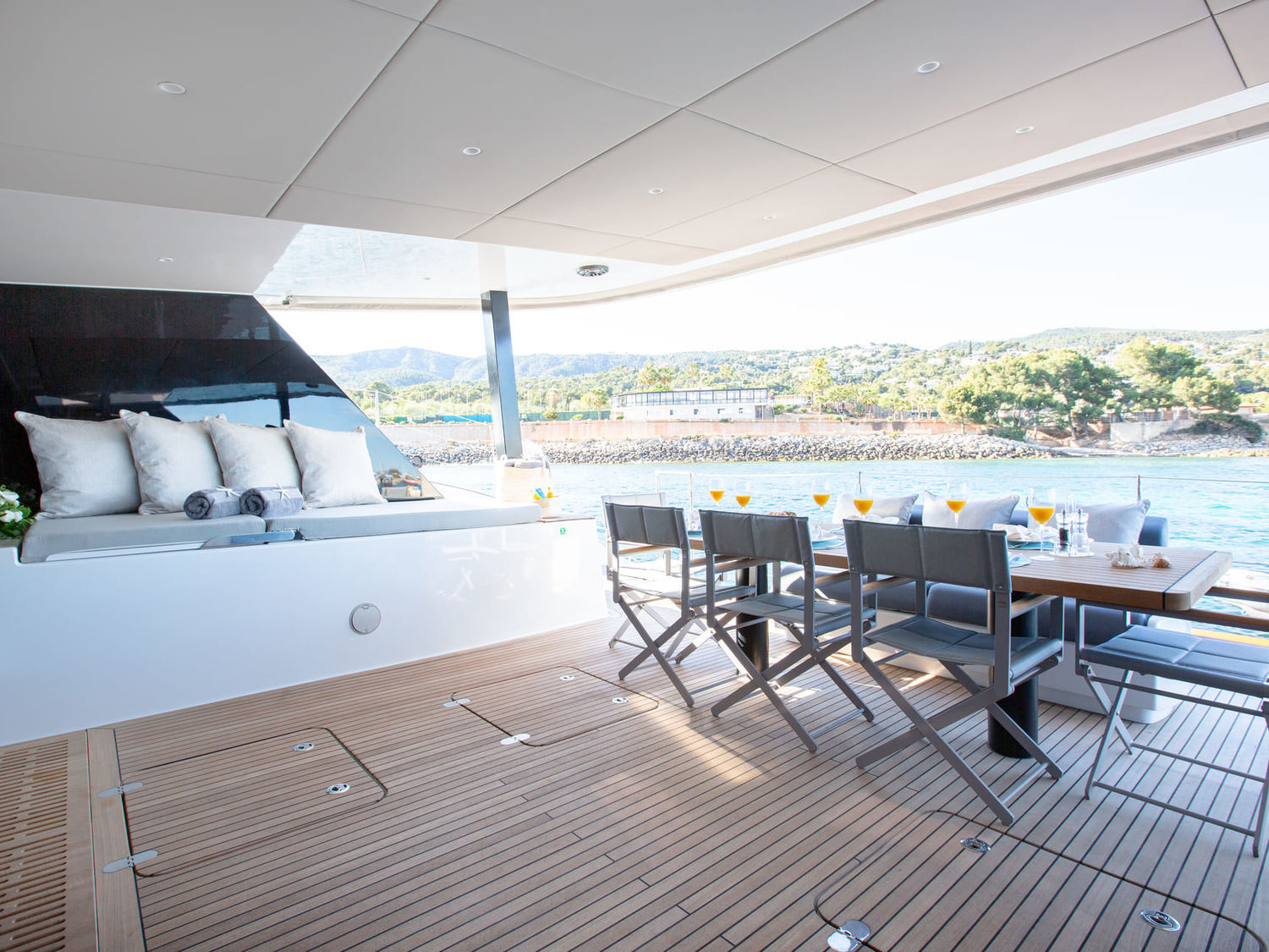 Forward of amidships the area is shaded by a hardtop with sunscreen skylights to keep the area naturally bright. The space has plenty of room for observation and exercise in the fresh air.