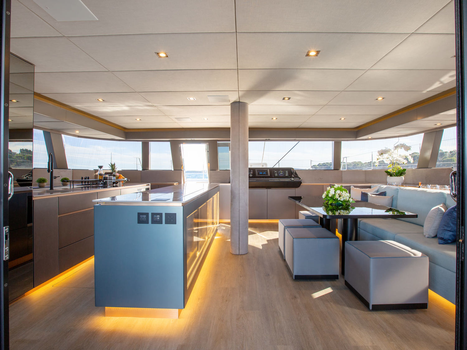 The guest and crew accommodation are placed within the hulls, leaving the central area dedicated to guest entertainment.