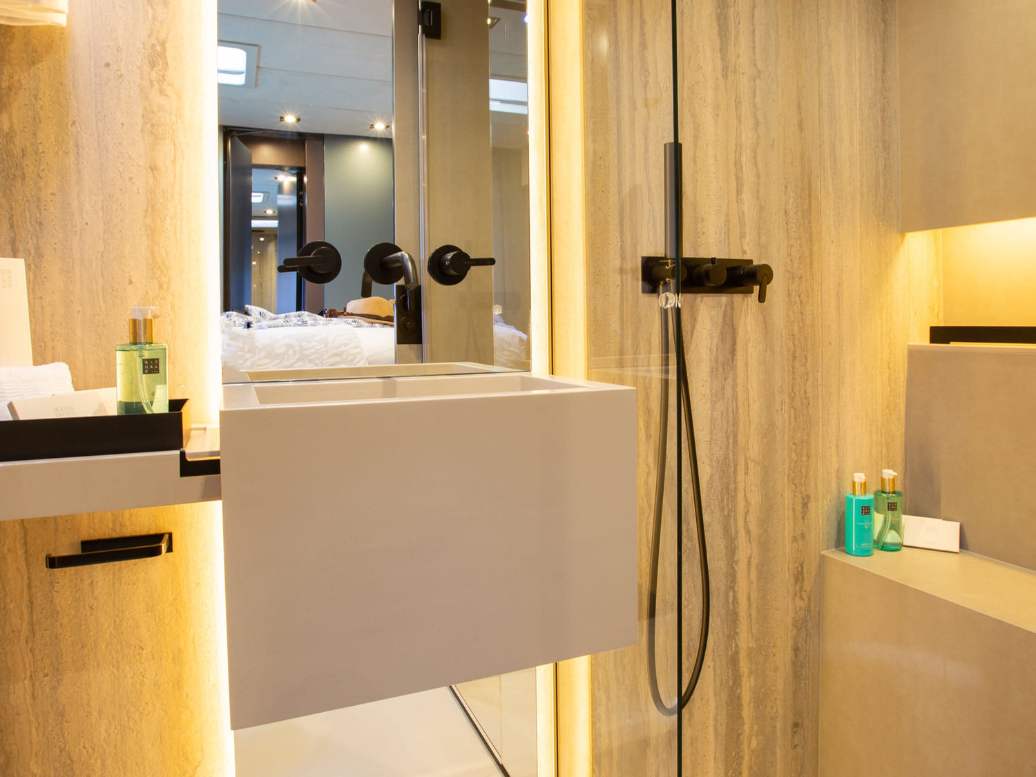 A stairway leads down both hulls for easy access to the water, and there is a hydraulic swim platform and a floating extension available for convenience.