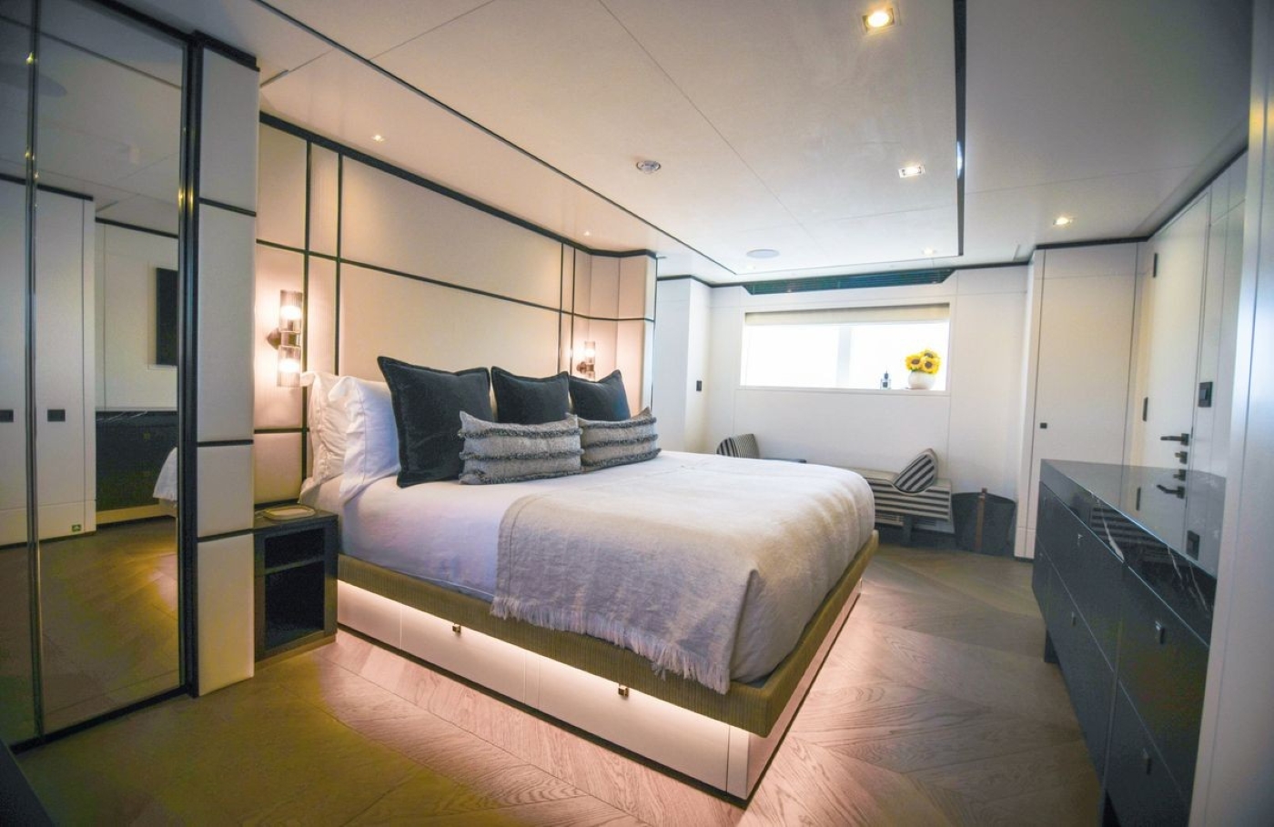 The interior and exterior styling comes from Q London with naval architecture from the shipyard. The accommodation capacity includes 5 cabins for 10 guests and a further 4 cabins for a crew of 8.