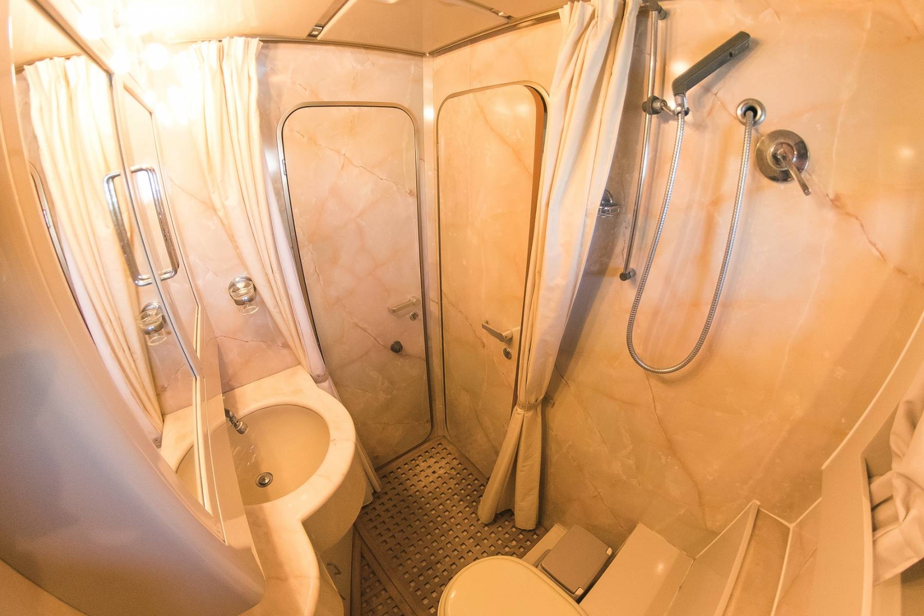 Here, a C-shaped sofa, coffee table and widescreen TV create a cosy place to lounge and pass the time between destinations, and opposite there is another sofa for guests and visitors to spread out.
