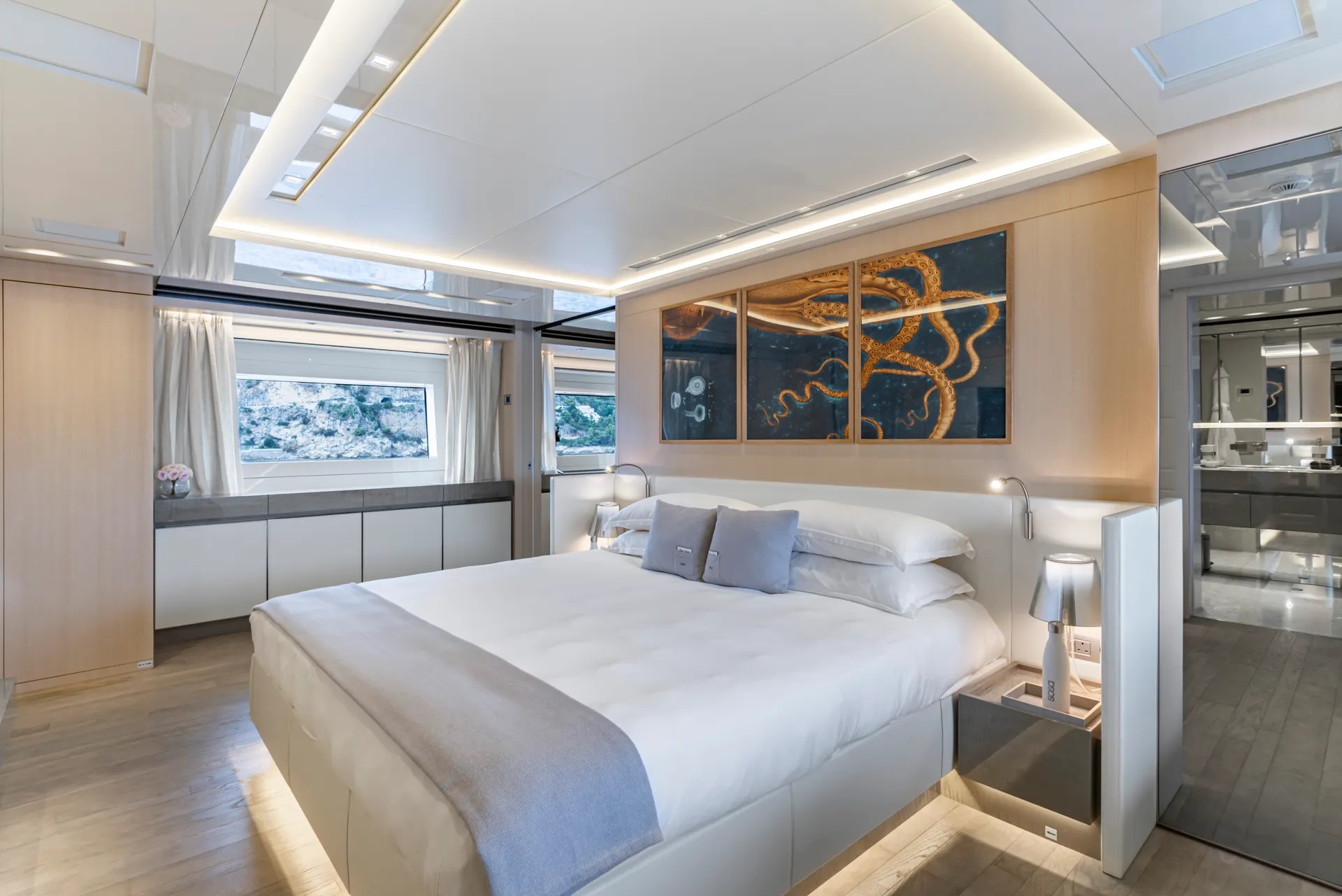 The Master suite is forward on the main deck, followed by the galley to port and main foyer with day head to starboard.