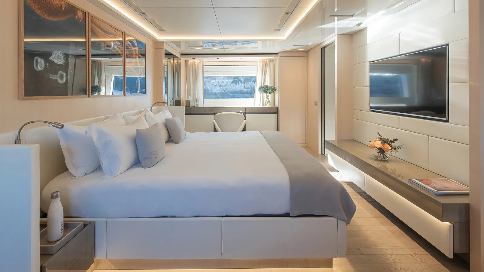 The Master suite is forward on the main deck, followed by the galley to port and main foyer with day head to starboard.