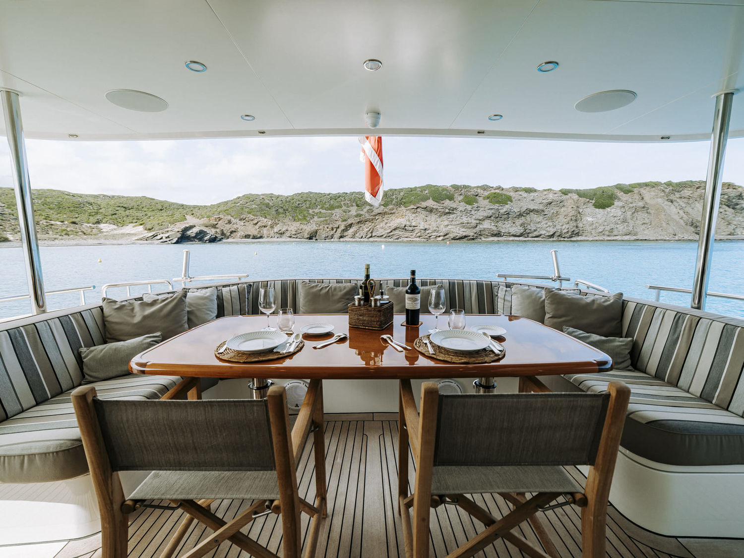 Stairs lead up to the main deck aft, where there is a C-shaped sofa, table and movable chairs to make a desirable alfresco dining are out of the sun.
