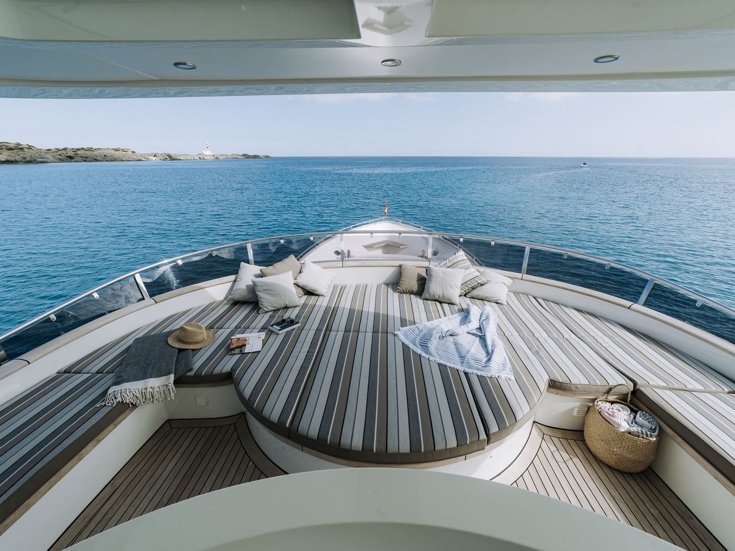 Stairs lead up to the main deck aft, where there is a C-shaped sofa, table and movable chairs to make a desirable alfresco dining are out of the sun.