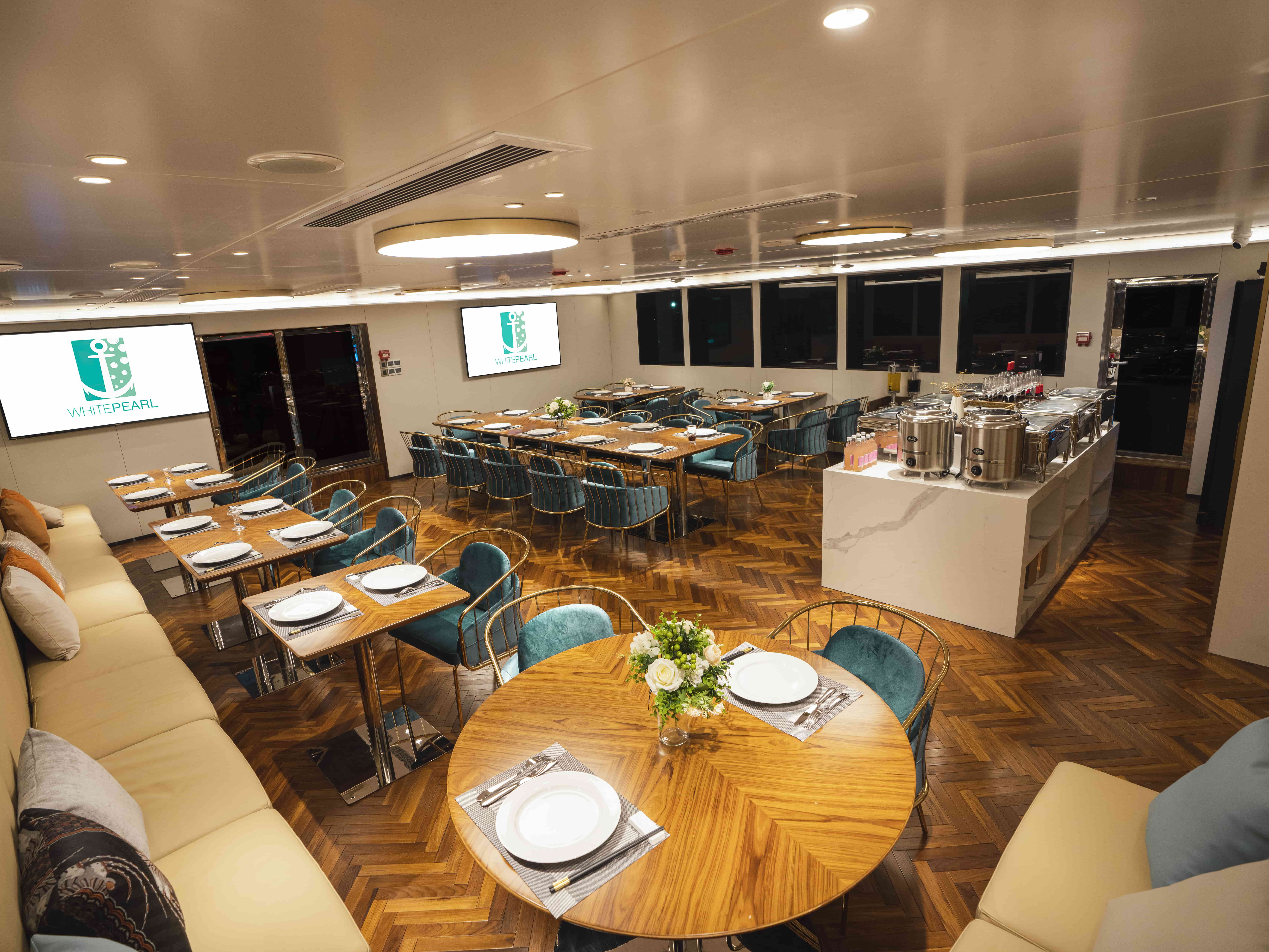 The spa room and camera room are amidships to port, and to starboard is the gym/entertainment room with games consoles and a business centre. The kitchen is behind to starboard, and the interior dining area seats all guests around several tables for a more intimate dining experience with a cafe and bar for drinks to suit the time of day.