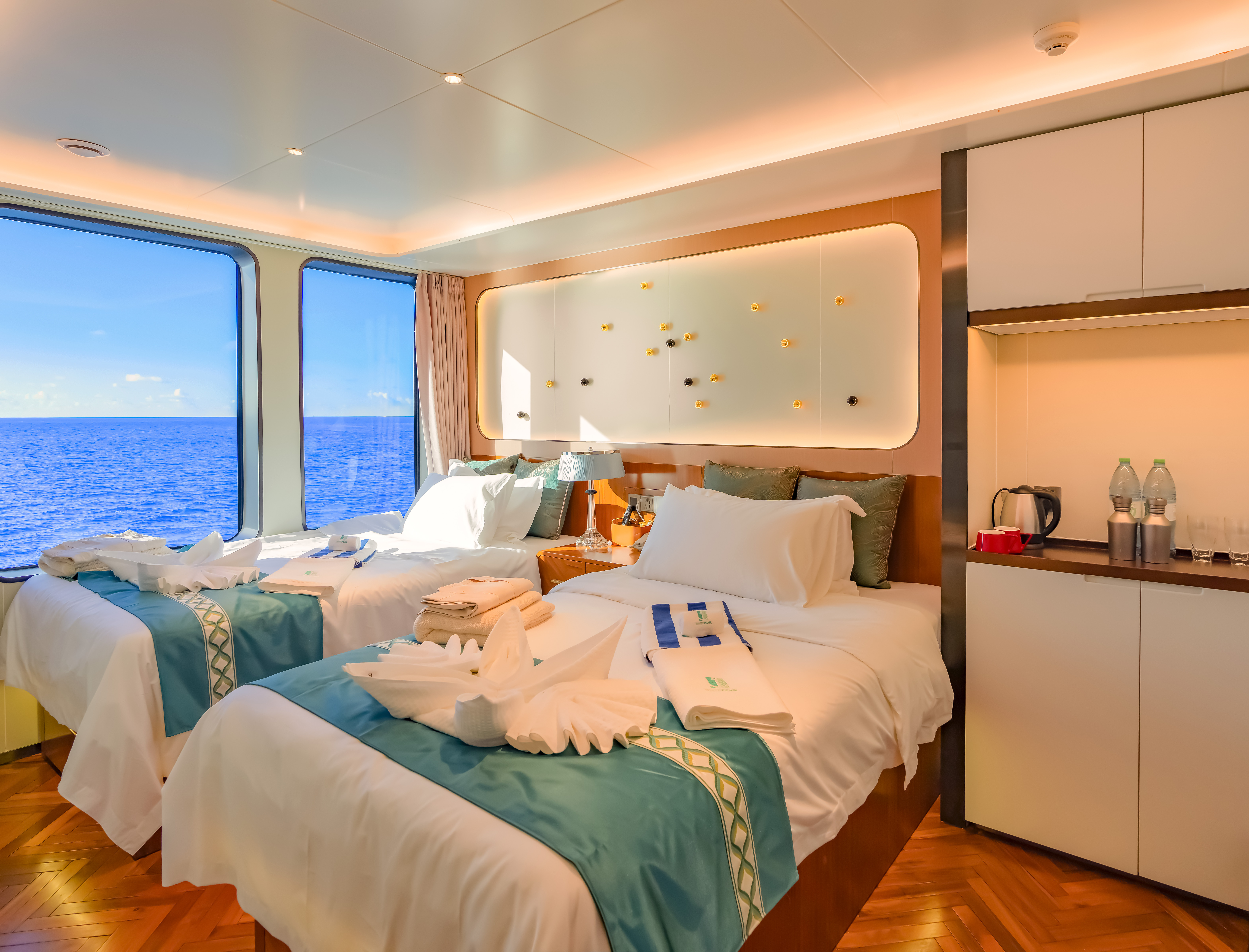 The main deck hosts the largest suite forward, followed by the two Master cabins immediately behind.