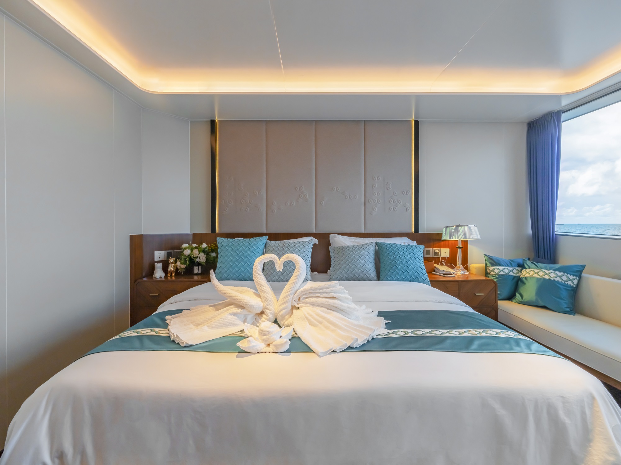 The main deck hosts the largest suite forward, followed by the two Master cabins immediately behind.