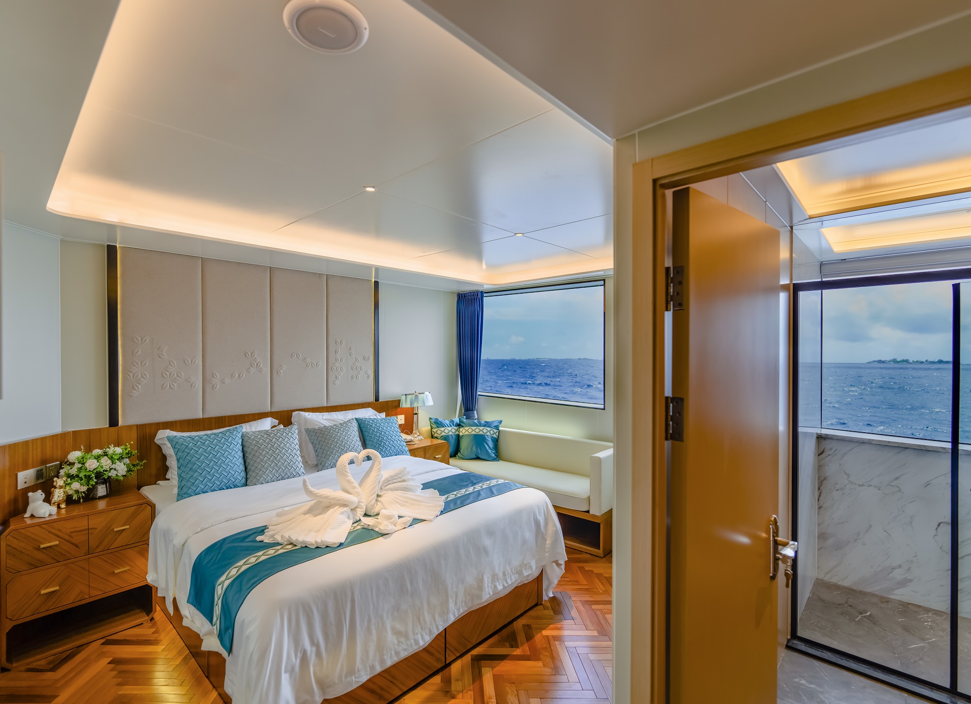 The main deck hosts the largest suite forward, followed by the two Master cabins immediately behind.