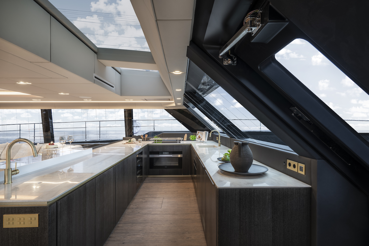 The galley is placed forward to port while the helm controls are to starboard, and a forward doorway centre leads out onto the foredeck. The guest area behind is furnished with a sofa-lounger, armchair and coffee table to port ...