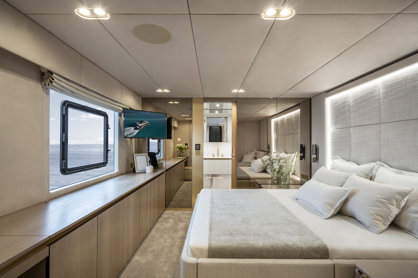 The guest area behind is furnished with a sofa-lounger, armchair and coffee table to port and a second sofa, table and chairs to starboard to create a comfortable and cosy formal dining area and place to spend time on ...