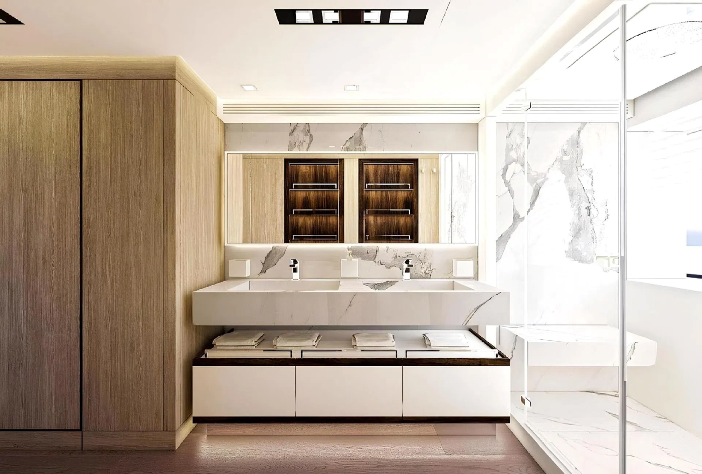 Twin Caterpillar C32 engines produce a top speed of 25 knots, a fast cruising speed of 20 knots and a range of 1,150 nautical miles at 10 knots.