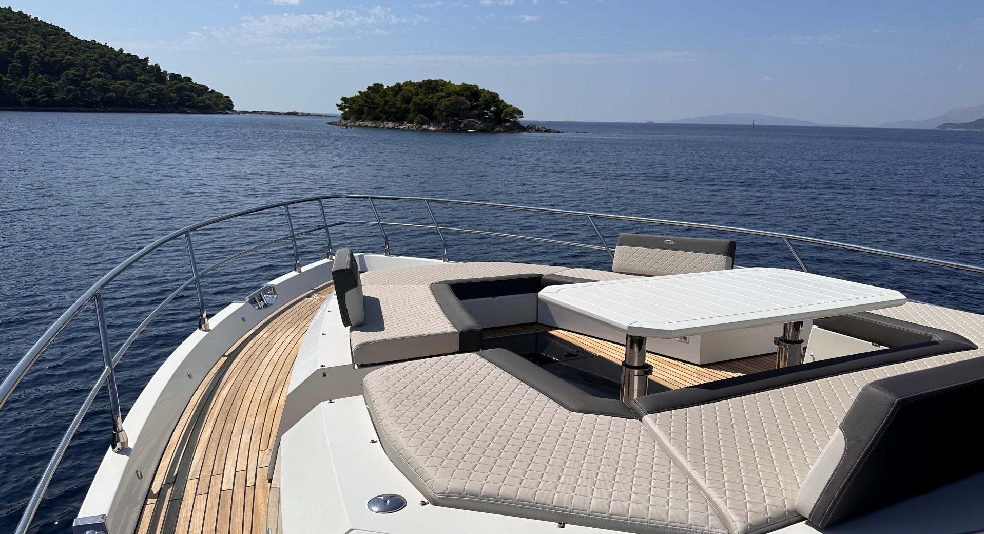 The foredeck has its own C-shaped sofa and drinks, ...