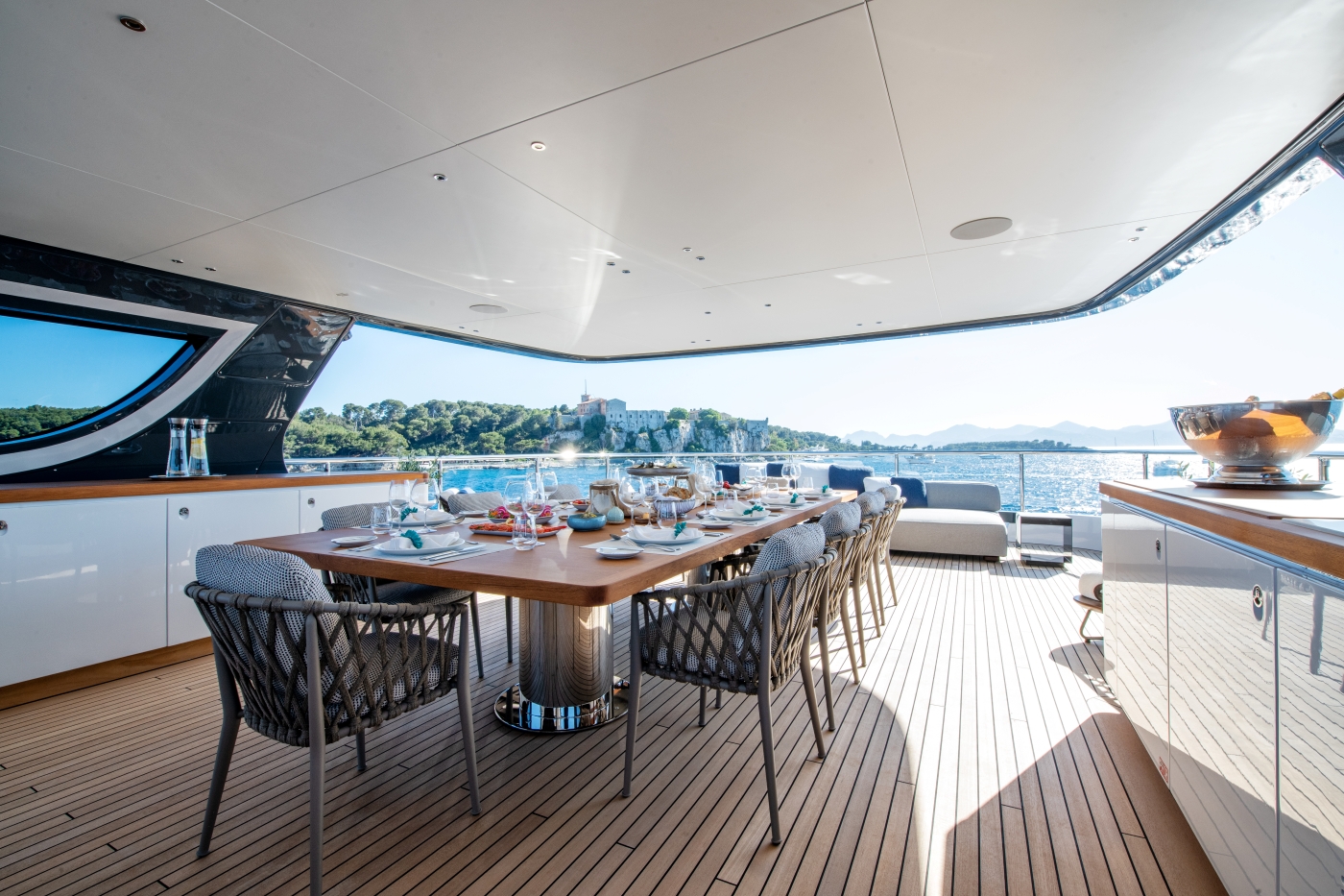 The shaded amidships section hosts a large alfresco dining table to seat 12 guests, along with a