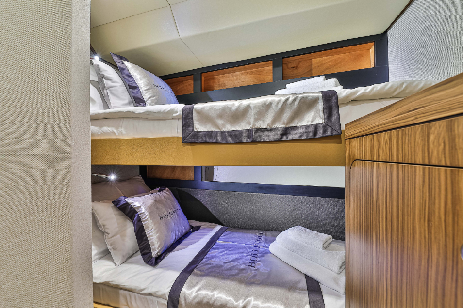 Within, there is a queen-sized bed, widescreen TV, a chair and side table beneath the port window, plenty of storage and an en-suite bathroom with a sink, toilet, bidet and shower.