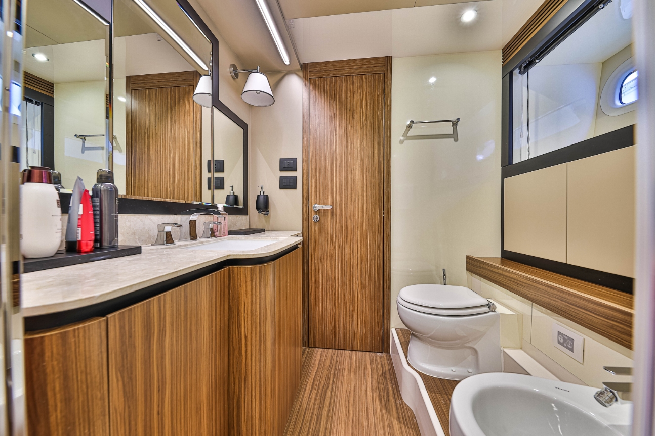 The guest and crew accommodation is placed on the lower deck, while the main deck layout places the galley forward to port with the helm station opposite, and this area is closed off from the guest area behind for fewer disturbances.