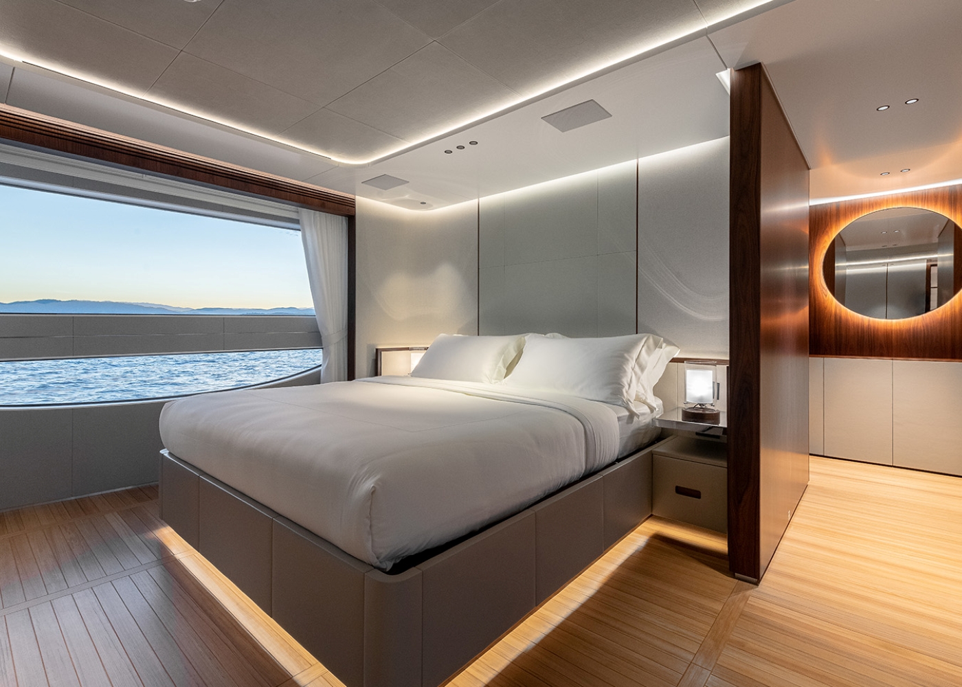 Aft, the skylounge is fitted with a bar to port and an L-shaped sofa on the coffee table on both sides of the room, plus a wall-mounted widescreen TV on the forward starboard wall.