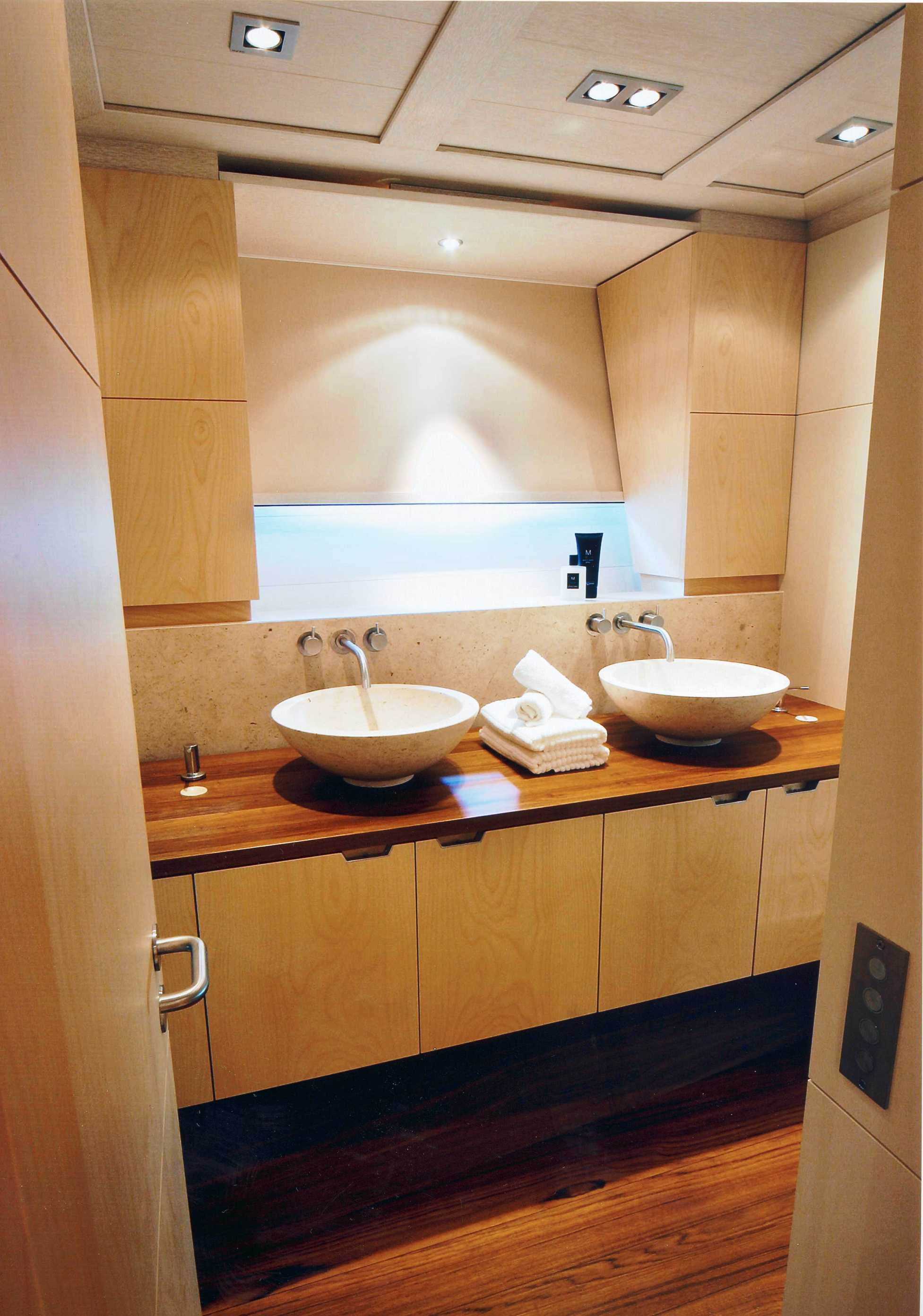 Bathrooms have floating teak counter tops with stone basins with hidden backlighting. Also featured are Stainless Vola taps and fittings.