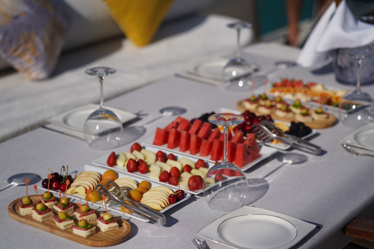 group dining and lounging, with a wall-mounted widescreen TV for entertainment in the evenings and while cruising.