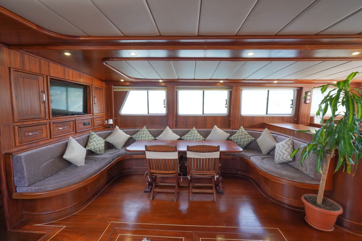 There is a C-shaped sofa and large table for elegant alfresco dining, and the stern has two large sunbeds for guests to rest in the warmth after a large meal.
