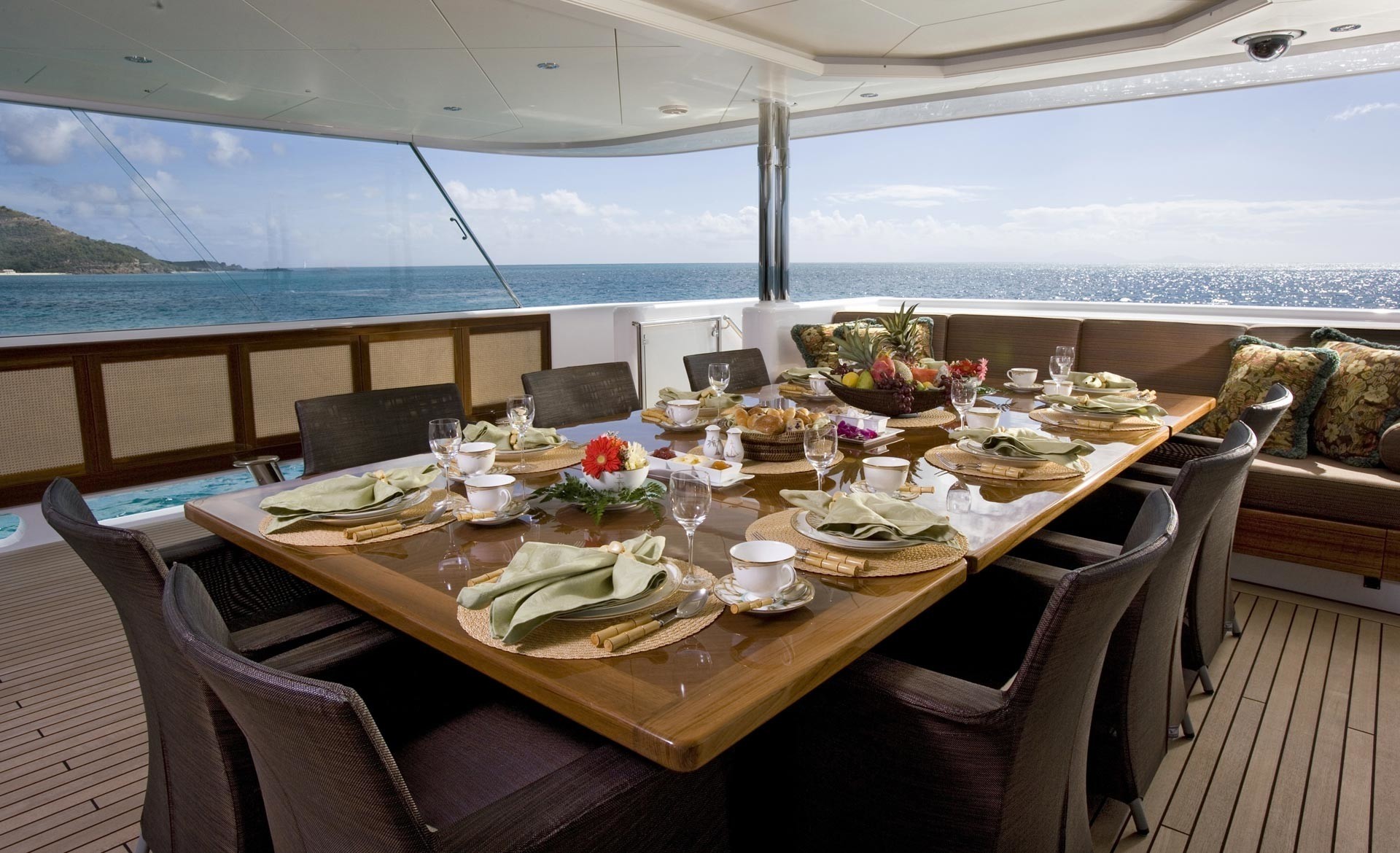 The entire width and length of the sundeck is useable guest space and includes comfortable sun pads and lounges aft, moving towards a ten-piece teppanyaki bar with 10 bar stools as a centrepiece and a deck Spa Pool with sun pads forward.