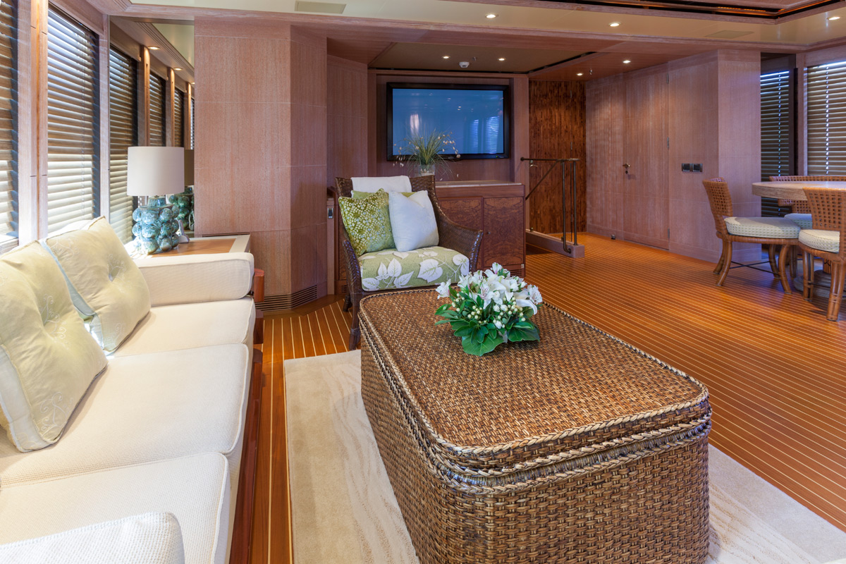 The entire width and length of the sundeck is useable guest space and includes comfortable sun pads and lounges aft, moving towards a ten-piece teppanyaki bar with 10 bar stools as a centrepiece and a deck Spa Pool with sun pads forward.