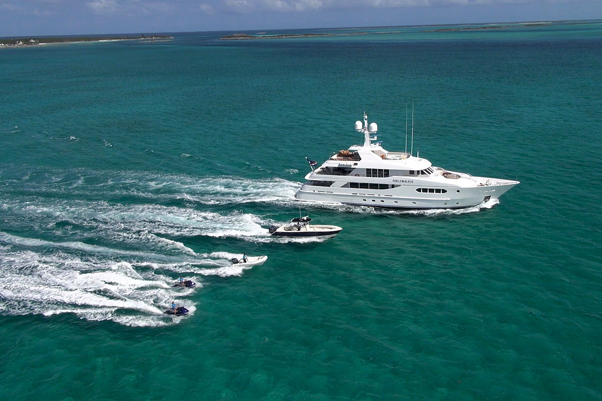 Motor Yacht PERLE BLEUE is equipped with a full range of toys including a 34 Pursuit tender powered by twin 300hp Yamaha engines.