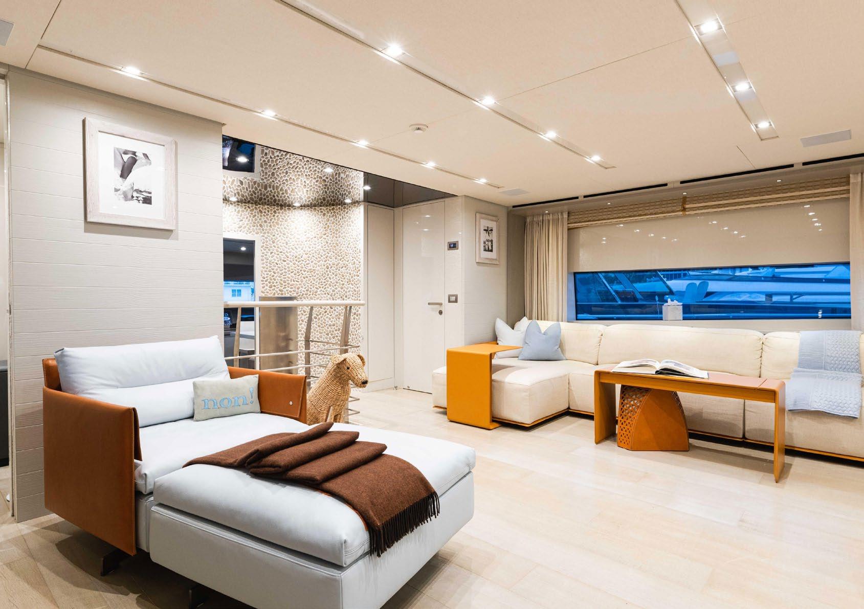 In the main salon, the staircase up to the skylounge is used as a focal point in the centre of the forward wall, and cool crisp blue artwork is placed on both sides. A large plush sofa with lounger arms is placed on the port side of the room, while a love seat is forward and two armchairs aft around a coffee table.