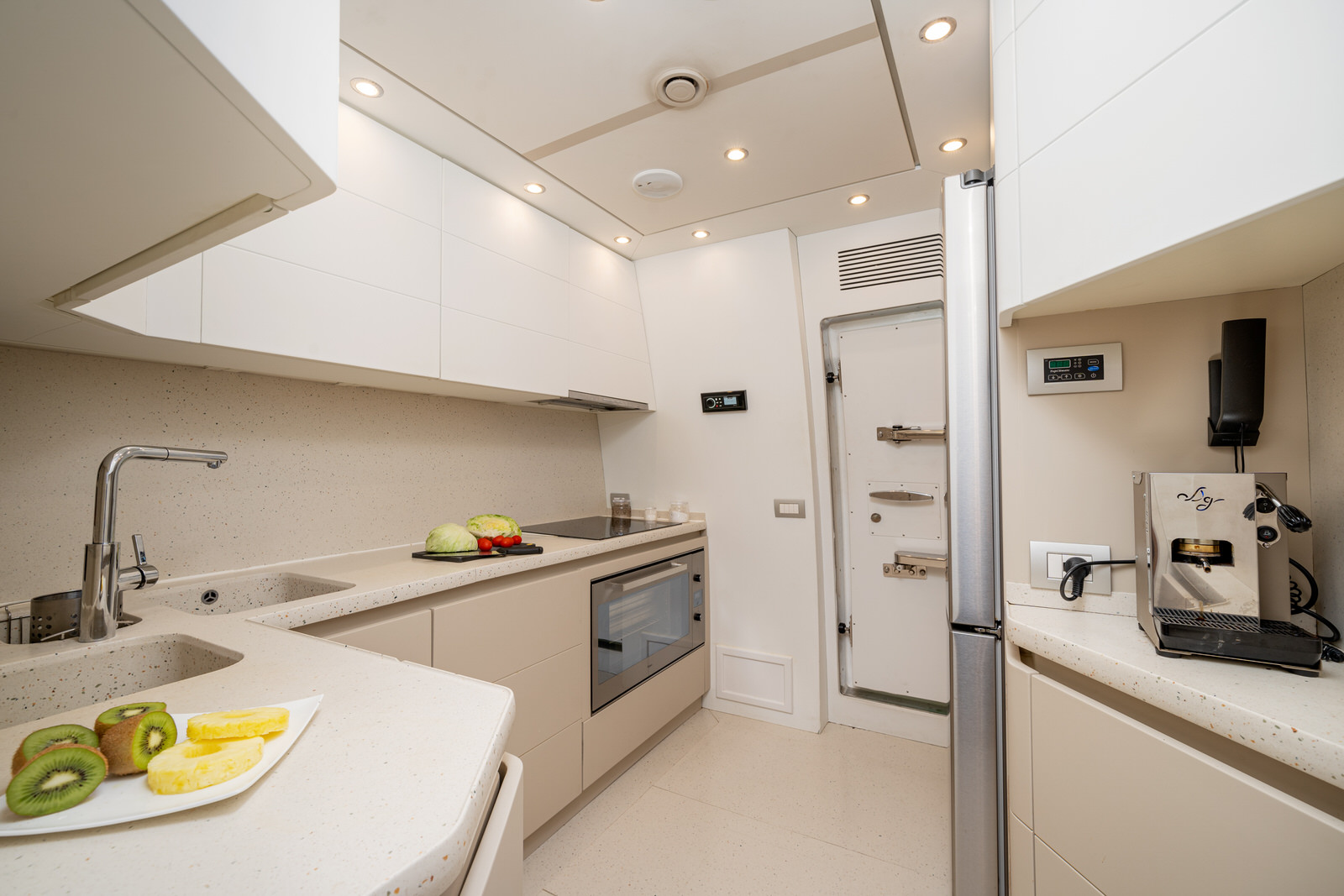 The galley and foyer with day head is immediately behind, followed by a large open-plan guest area which places the formal dining area forward to port and a sizeable C-shaped sofa and coffee table aft to port, plus a widescreen TV opposite.