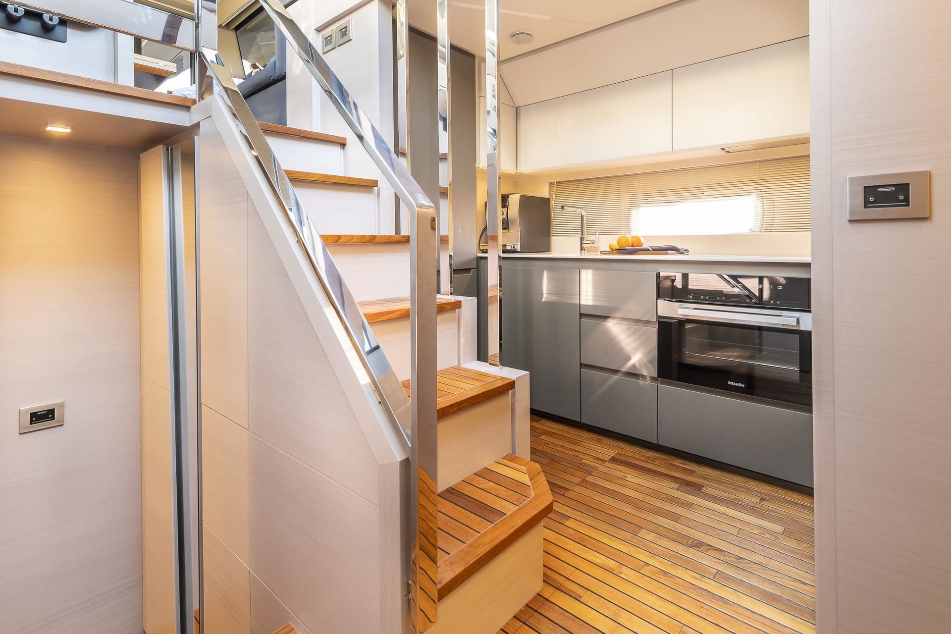 Side walkways along the main deck lead around to the foredeck, where the layout provides a ...