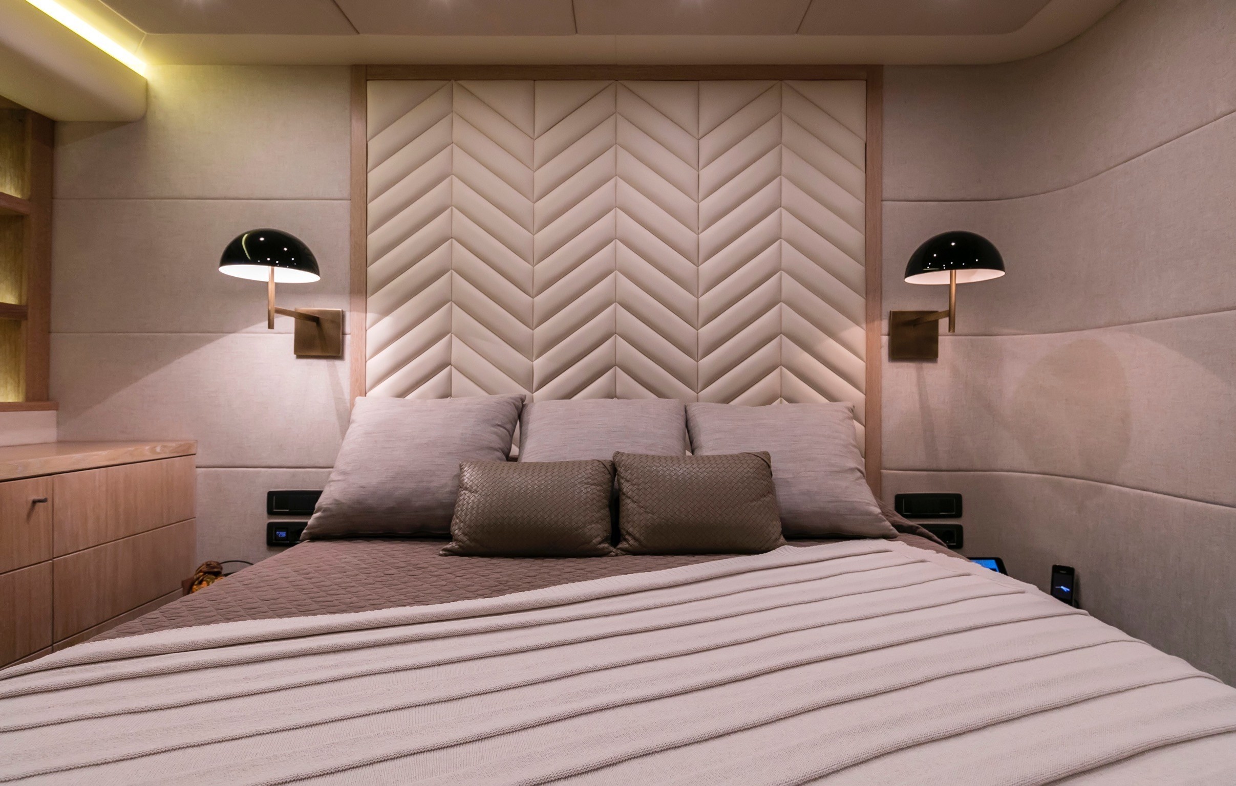 Accommodation is on the lower deck in 4 cabins. The master cabin is full beam of the yacht, with a center lined queen size bed, sofa and vanity. A VIP cabin offers a double bed. Two guest cabins each have side by side twin beds. All cabins have private en-suite facilities.