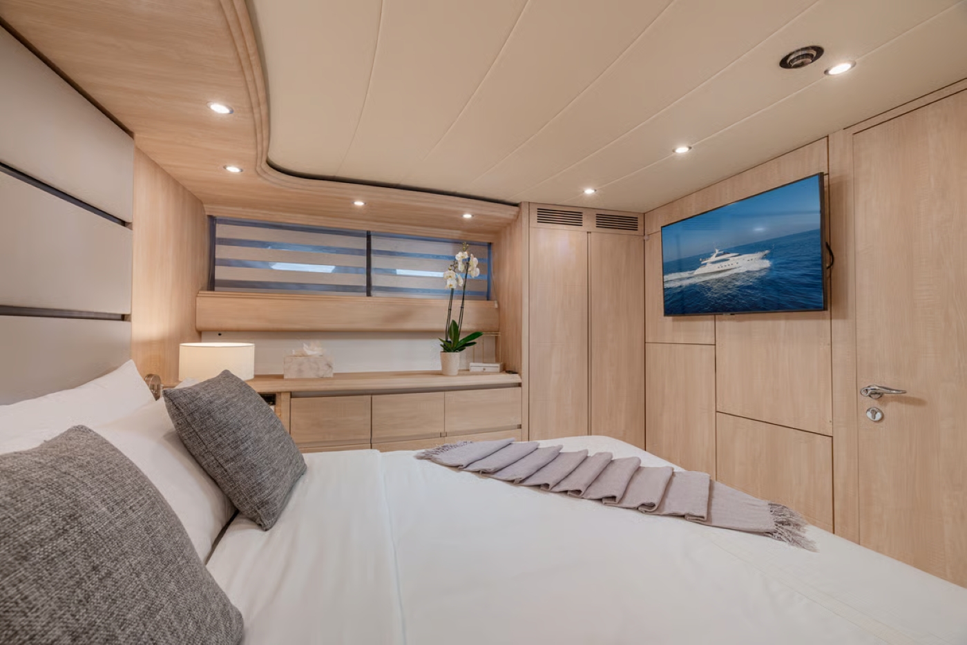 In the salon, a large C-shaped sofa and table are placed under the port window, and a widescreen TV is mounted on the wall aft to starboard.